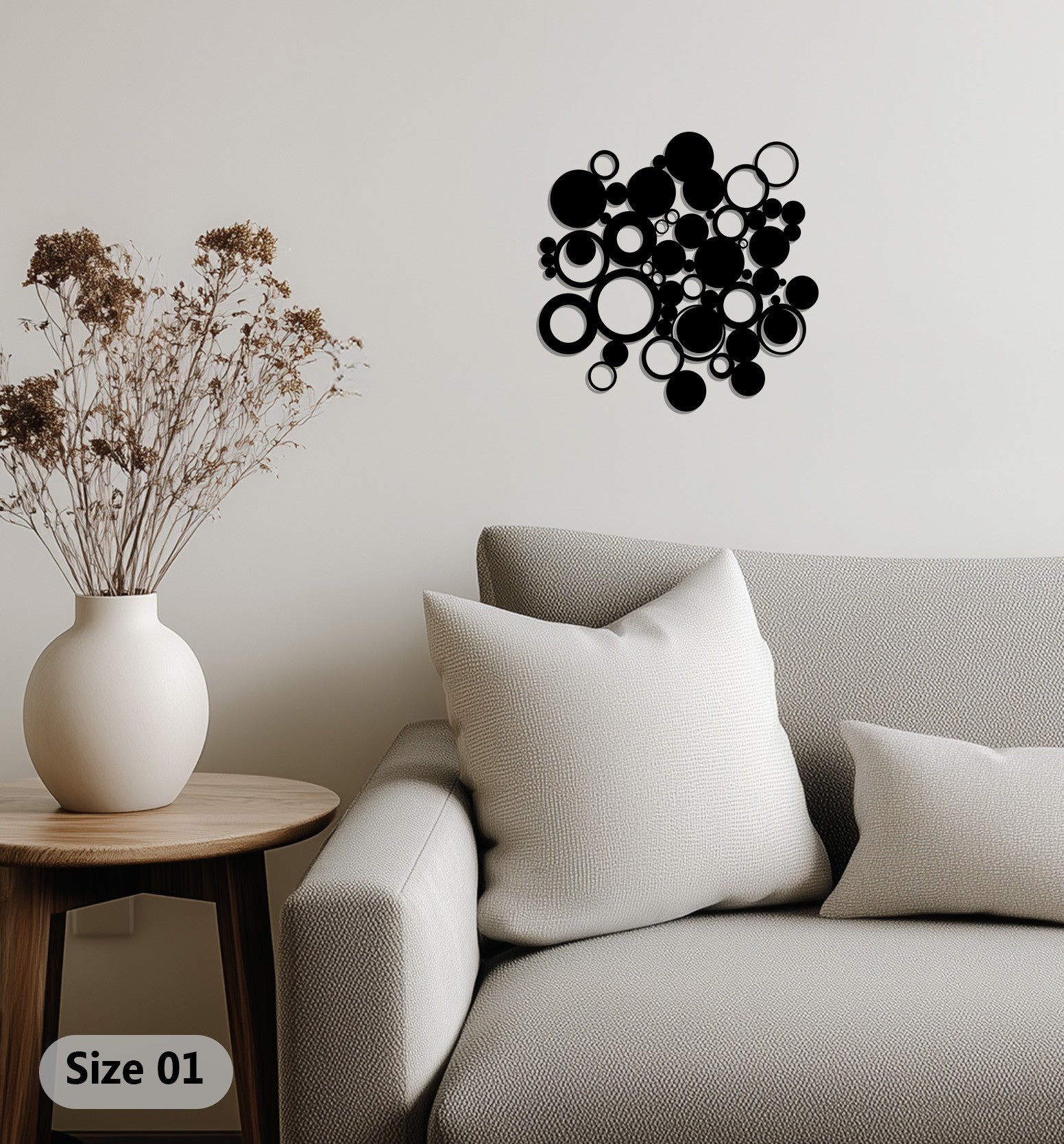 Its geometric yet playful design makes it versatile for both minimalist and artistic interiors, while the timeless round shapes symbolize unity and continuity. Whether displayed as a single statement piece or as part of a gallery wall, it’s the perfect choice for those who love modern décor with character.