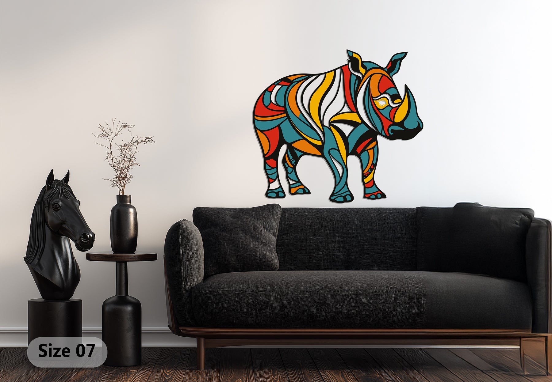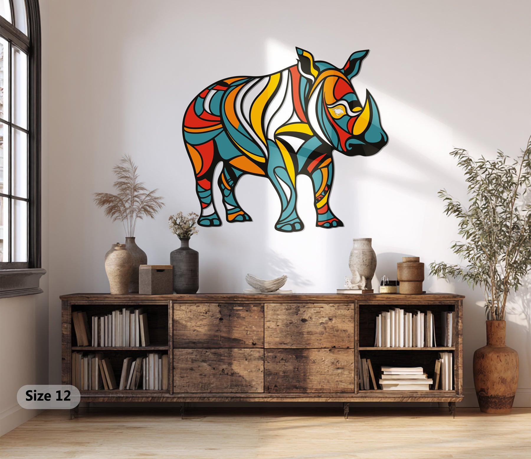 Add a bold statement to your interior with the Abstract Rhino Metal Wall Art, where modern design meets wild expression. This eye-catching piece showcases a rhino formed from flowing geometric shapes in vivid orange, teal, yellow, red, and white hues, all bordered with sleek black outlines for striking contrast.