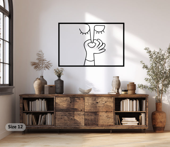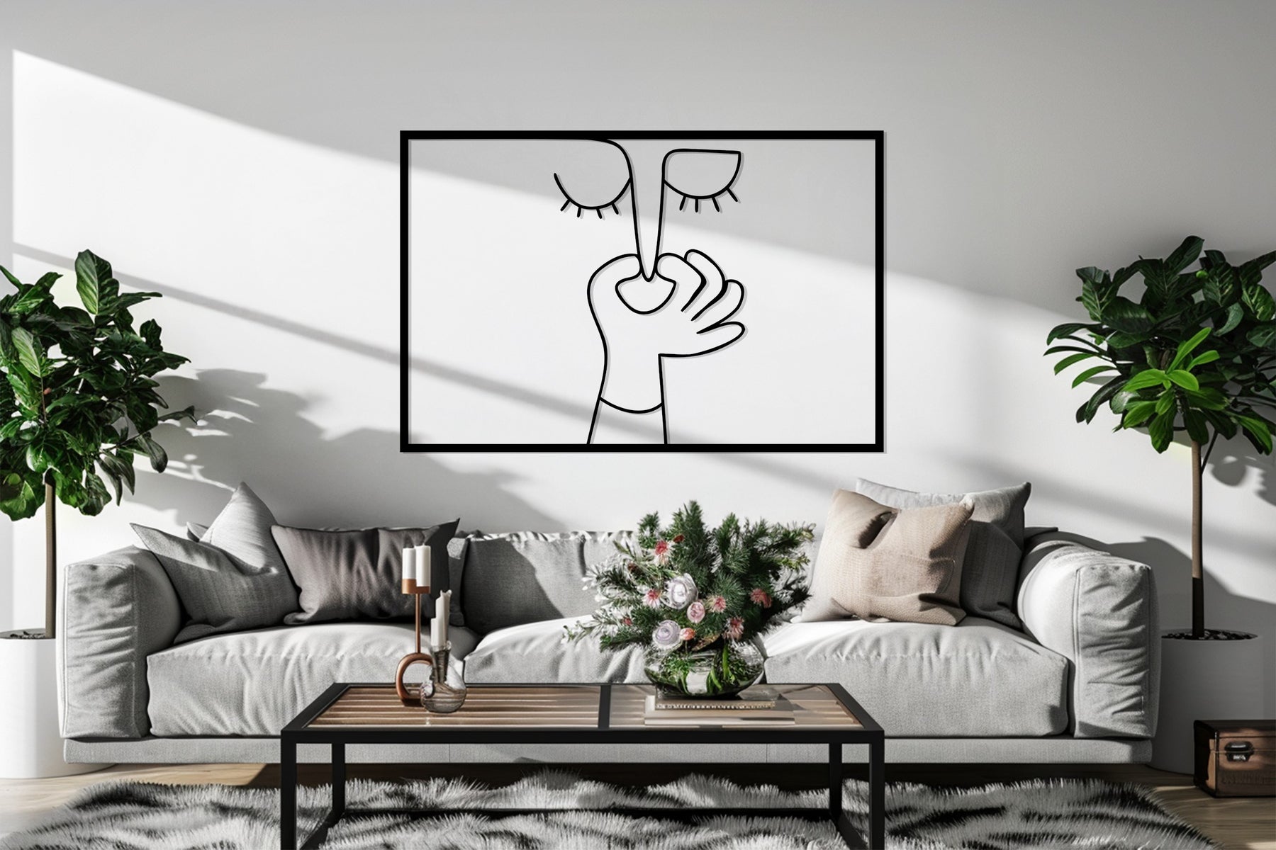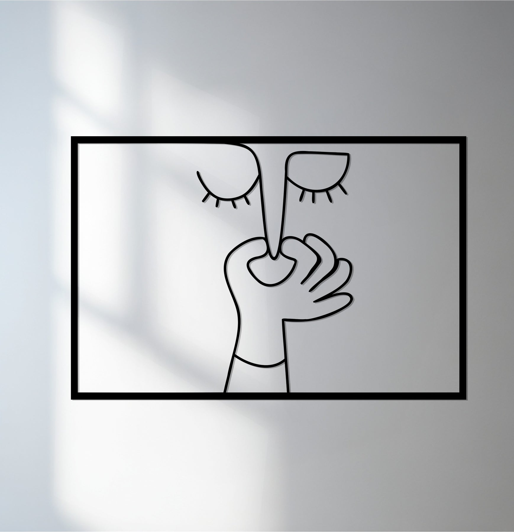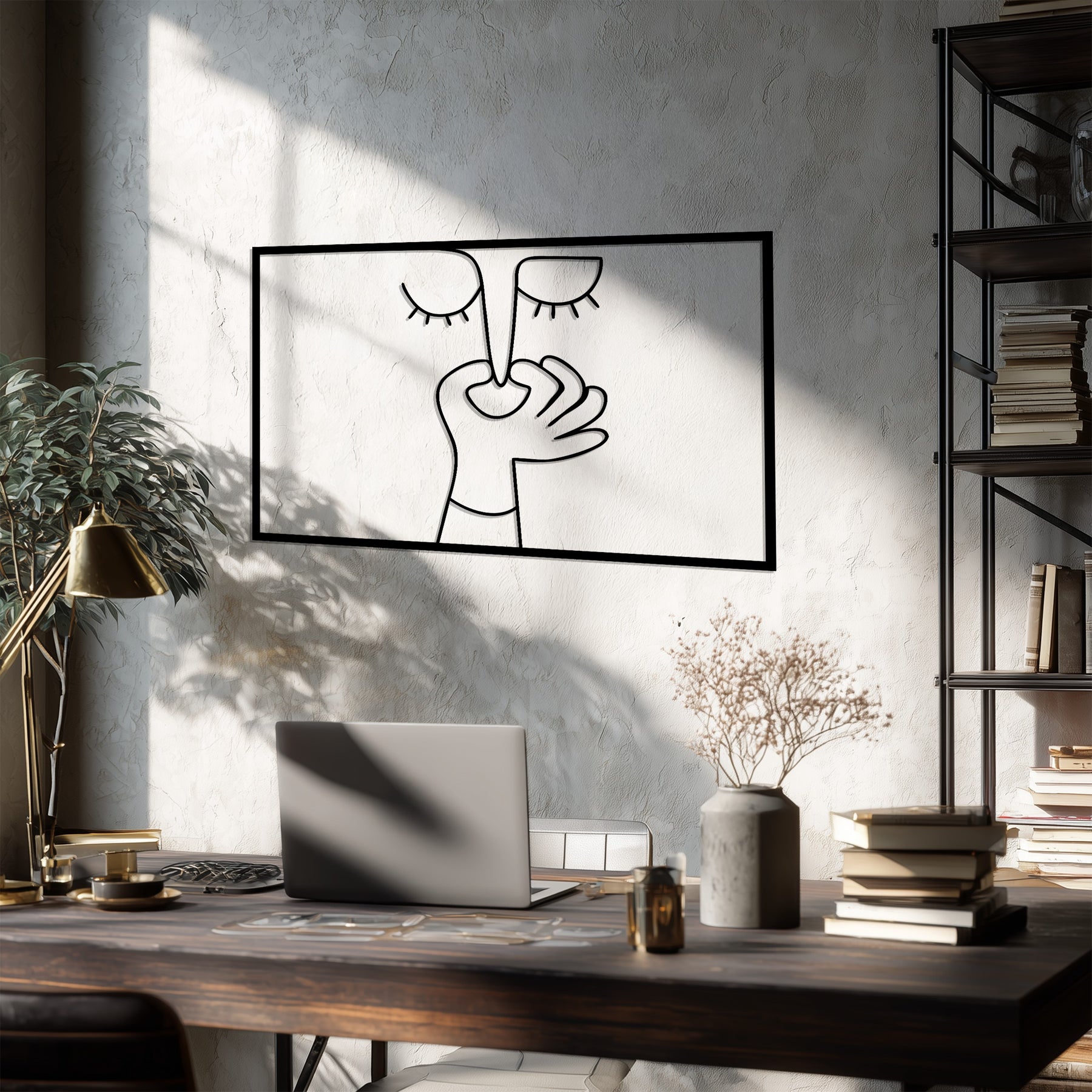 Add a touch of artistic elegance to your home with the Abstract Silence Face Metal Wall Art. This minimalist line design, framed in bold red, portrays a serene face making the universal “silence” gesture — a captivating blend of simplicity and expression.