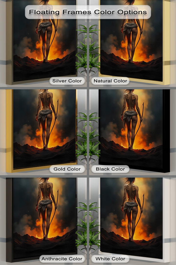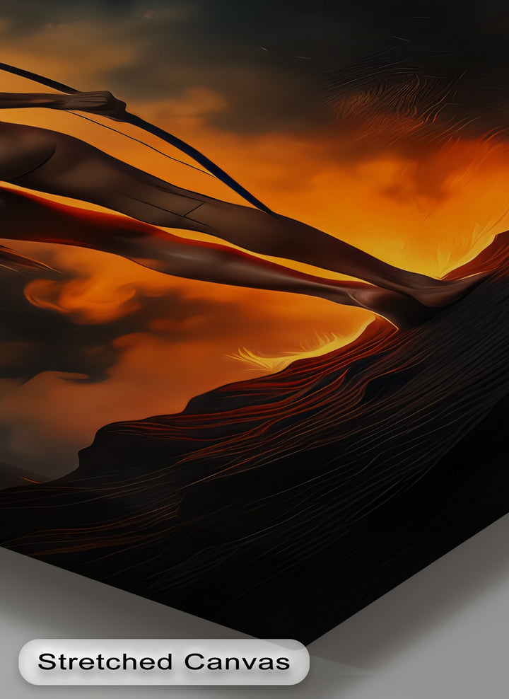 Step into a world of elemental power with Ashen Huntress, a mesmerizing nude canvas wall art capturing a lone warrior striding toward a glowing inferno. Her bow clenched tightly and silhouette bathed in golden light, she embodies resilience, danger, and mythic beauty.