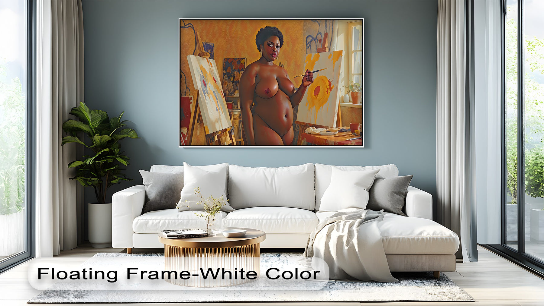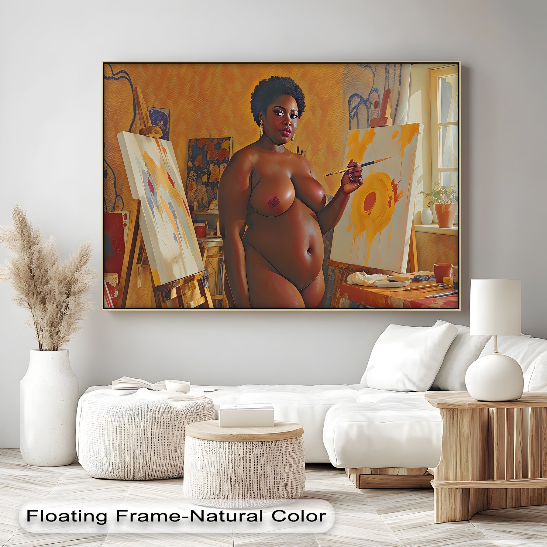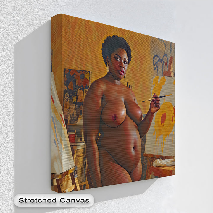 Surrounded by splashes of ochre, gold, and crimson, this artwork canvas celebrates curves, color, and creative freedom. The contrast between her natural form and the expressive canvases evokes themes of body positivity, self-expression, and the raw beauty of artistry. Every detail—from the warm-toned background to the flecks of paint—adds layers of meaning and emotion.