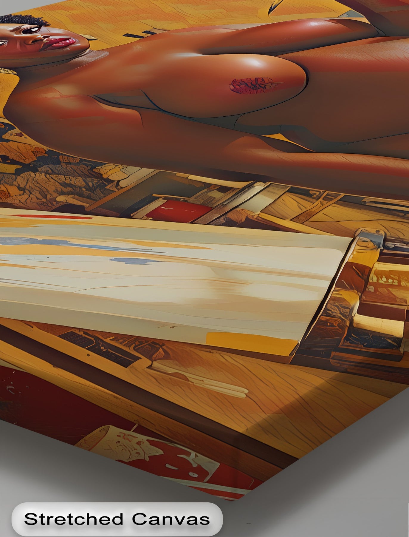 Bold Strokes invites viewers into a radiant moment of creation, where the artist becomes both subject and storyteller. This erotic canvas wall art features a confident nude woman mid-stroke, brush in hand, standing amidst vivid abstract works and sunlit textures. Her gaze is direct, unapologetic—commanding both admiration and reflection.