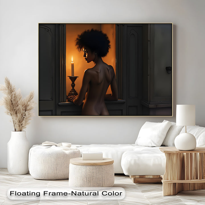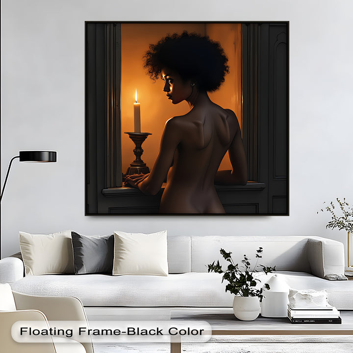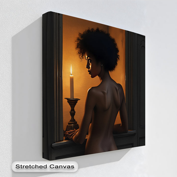 Step into the mysterious glow of Candlelight Gaze, a striking piece of erotic canvas wall art that merges classic elegance with modern sensuality. A woman illuminated by the soft, flickering light of a single candle stands gracefully in shadow—an image that evokes longing, reflection, and quiet power.