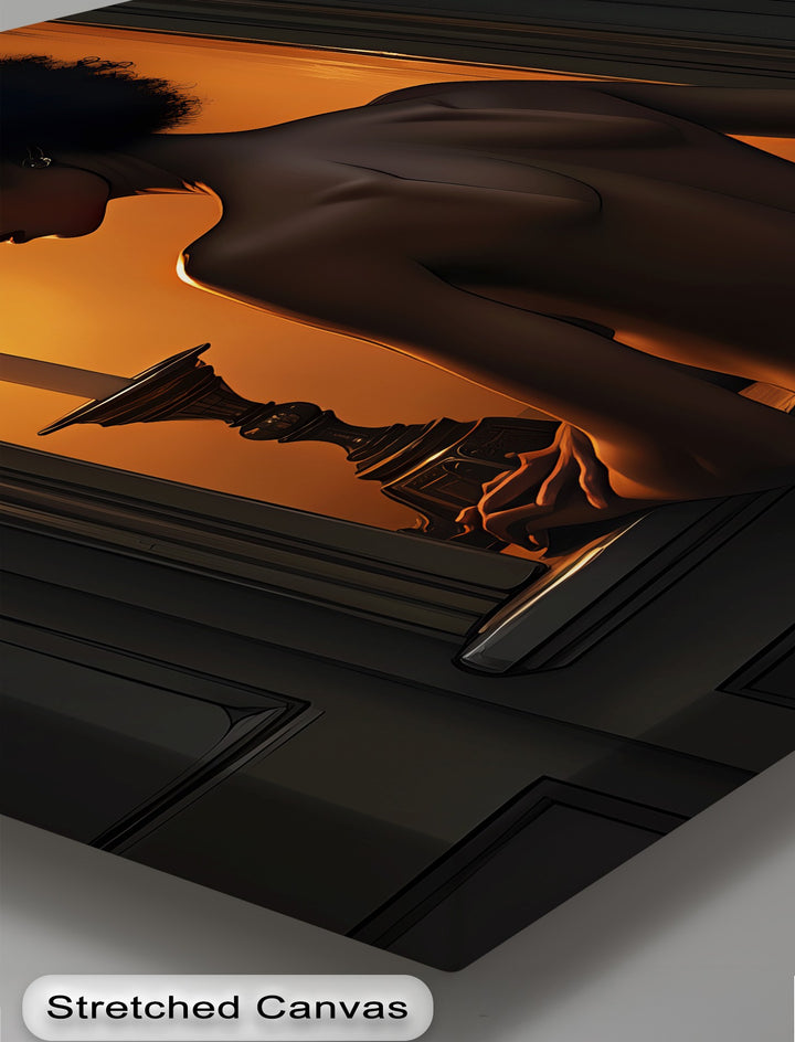 This dark moody canvas print captures an intimate moment with cinematic lighting and exquisite detail, making it the perfect centerpiece for sophisticated interiors. Whether in a bedroom, hallway, or private study, it adds a layer of mystery and allure. The neutral tones and warm amber light allow seamless pairing with other black and white wall art or modern framed canvas prints.