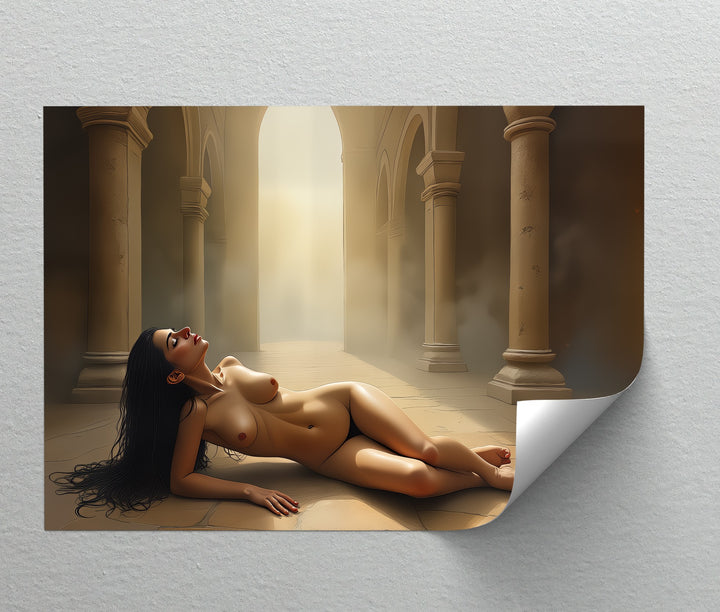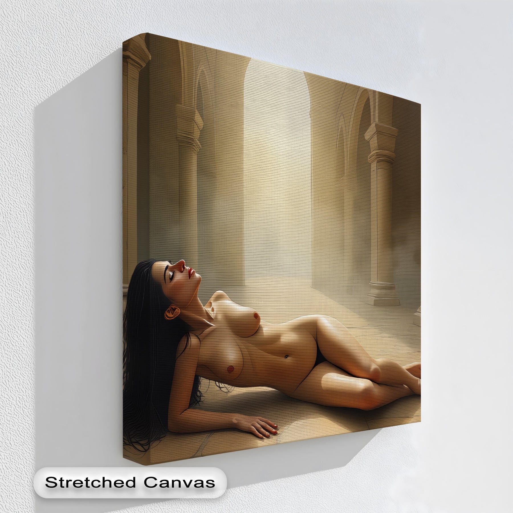 Enter the sacred silence of Cathedral Light, a sensual piece of erotic canvas wall art where light and form collide in timeless elegance. A woman lies in quiet surrender upon sunlit stone, her body caressed by golden beams pouring through towering arches—an ethereal balance between vulnerability and divine beauty.