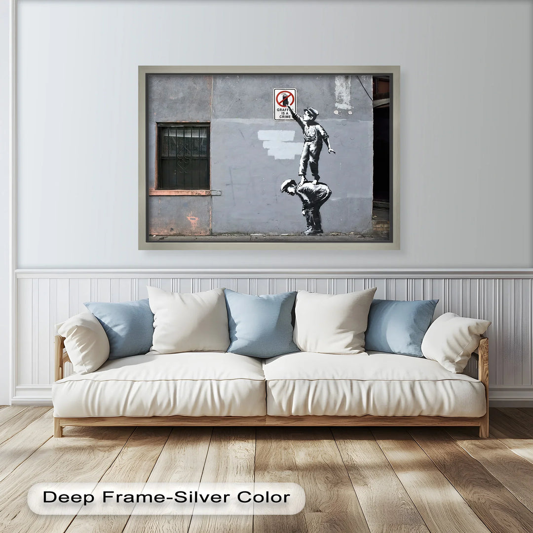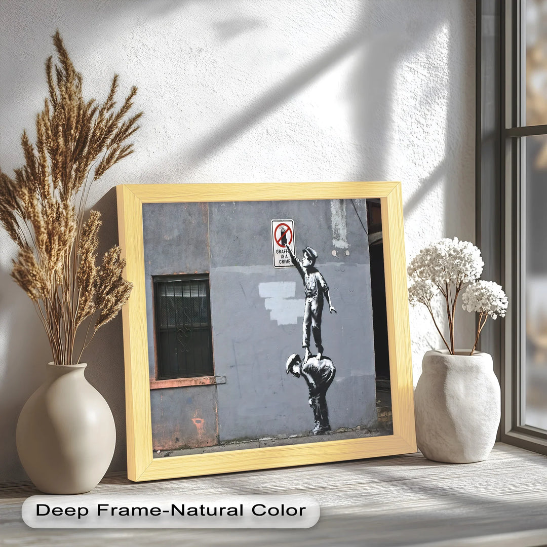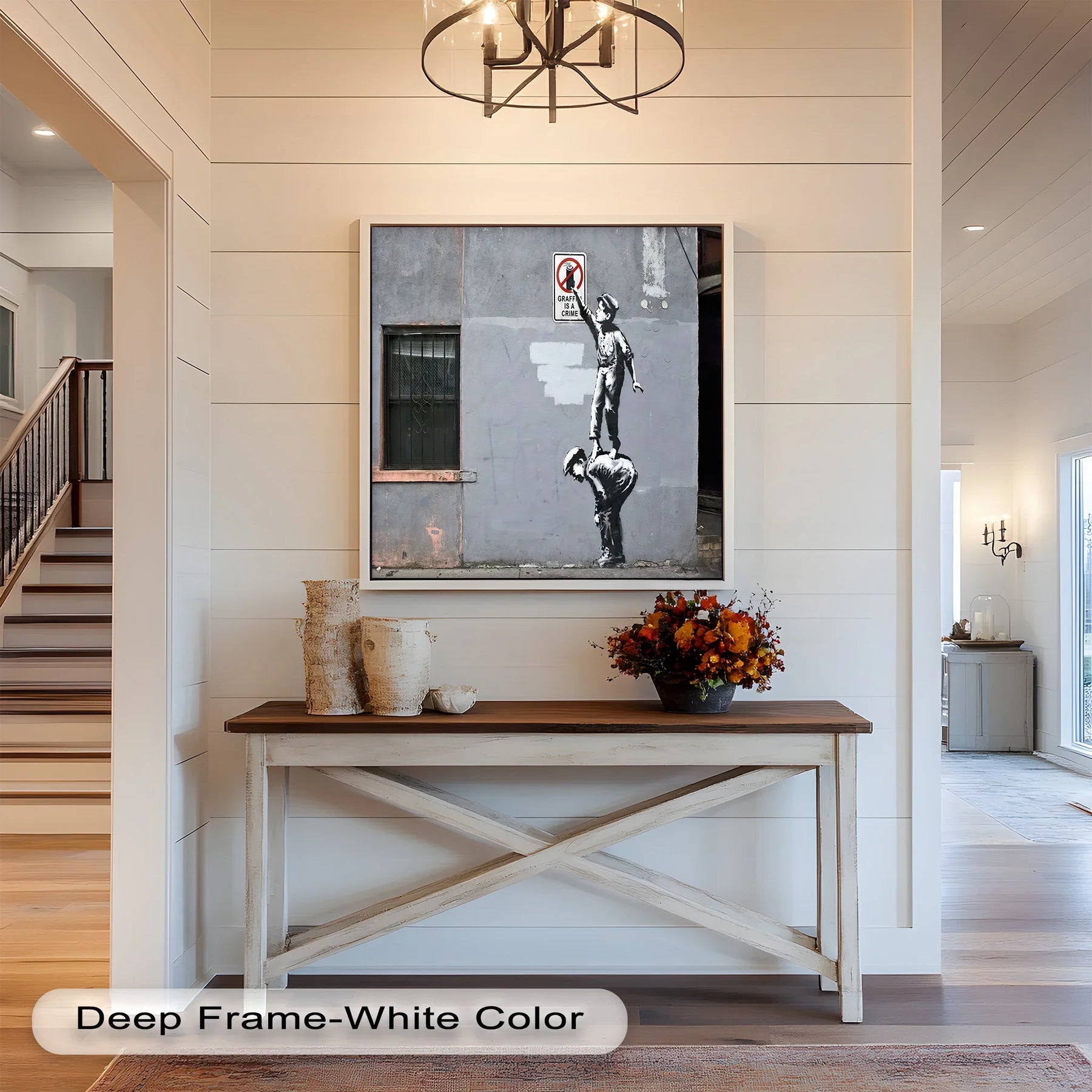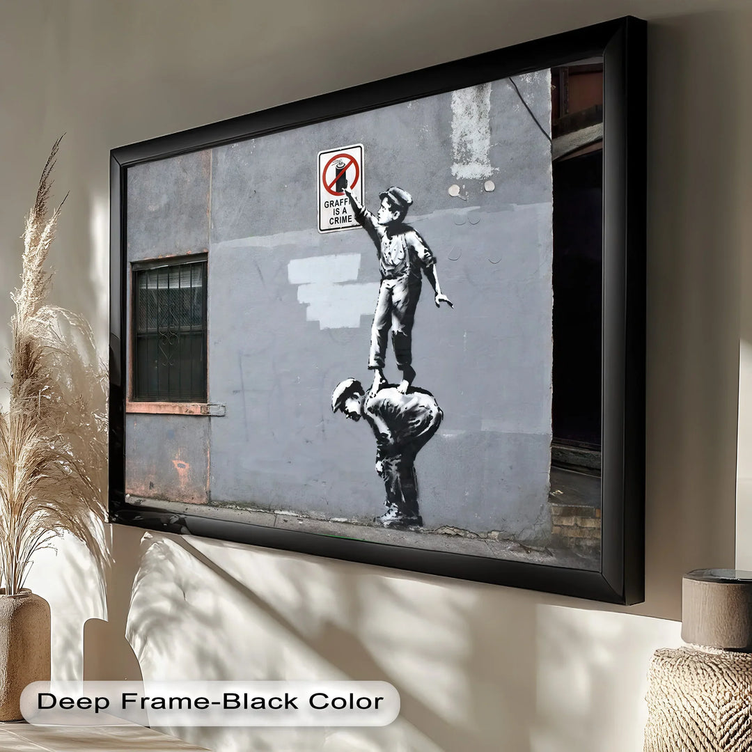 Challenge authority with Climb for Expression, a bold Banksy oil painting that transforms playful mischief into a powerful act of resistance. Two children—innocent yet daring—work together to defy the rules, as one climbs on the other's back to alter a “Graffiti Is a Crime” sign. This piece captures the eternal tension between societal control and youthful rebellion.
