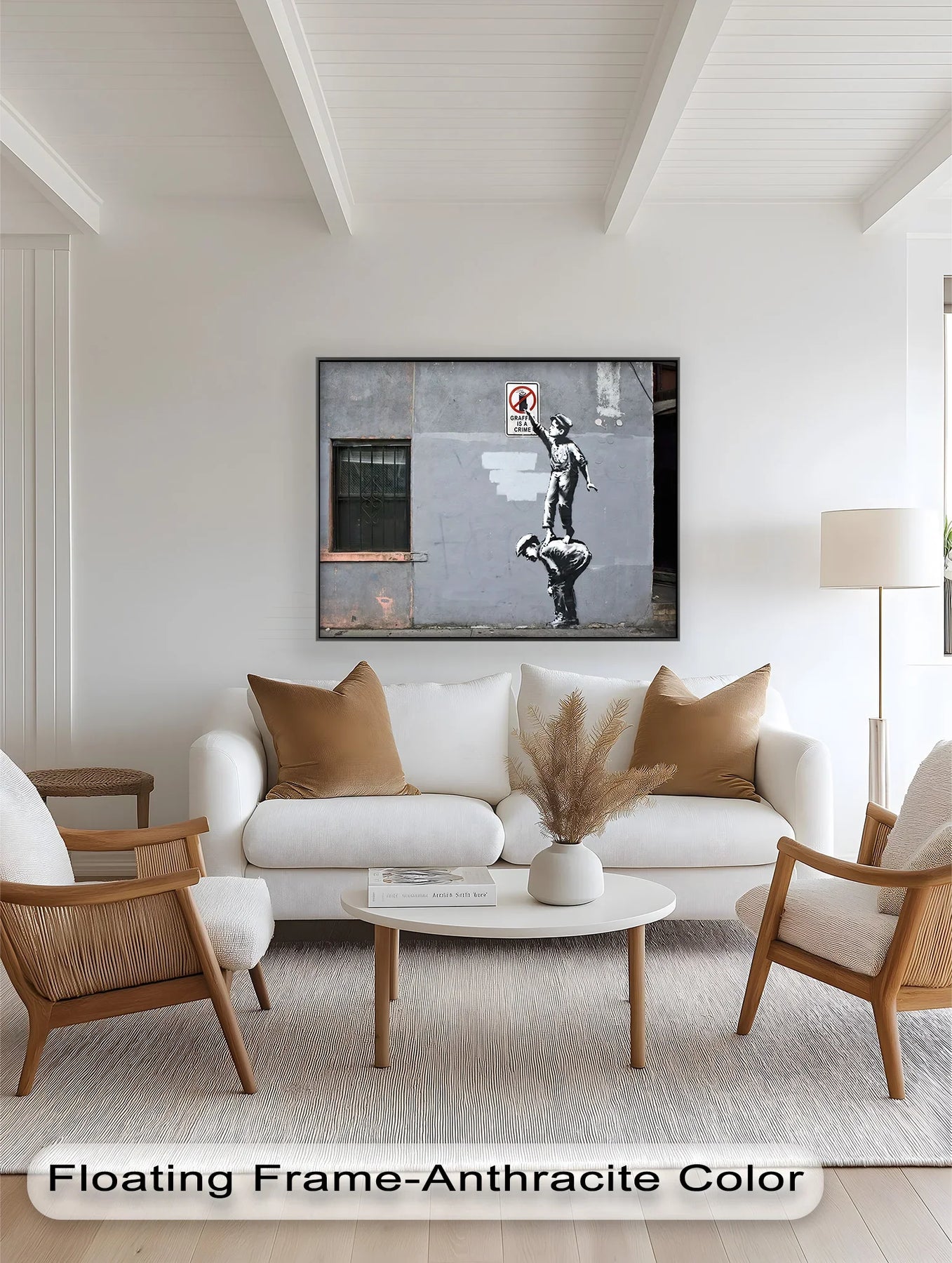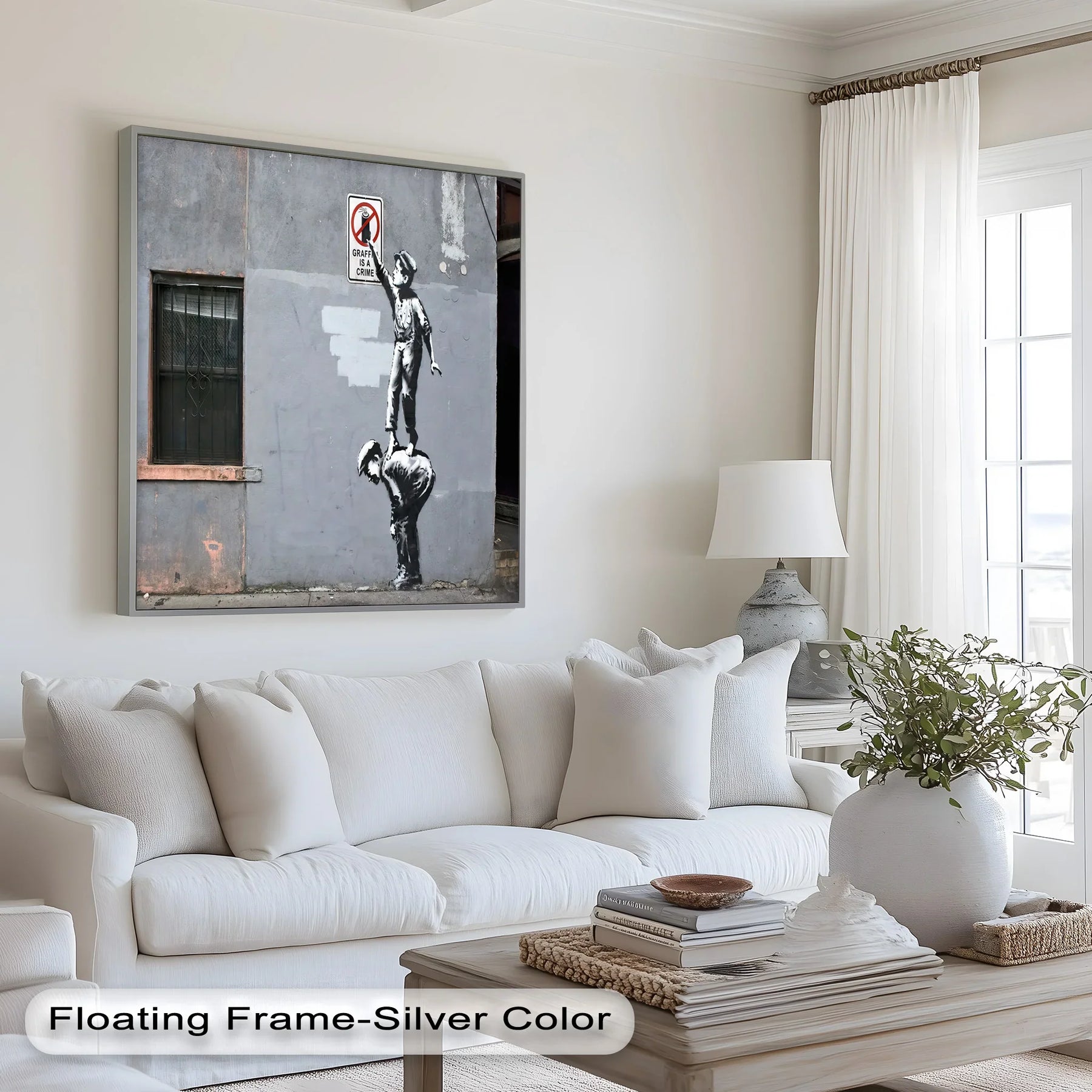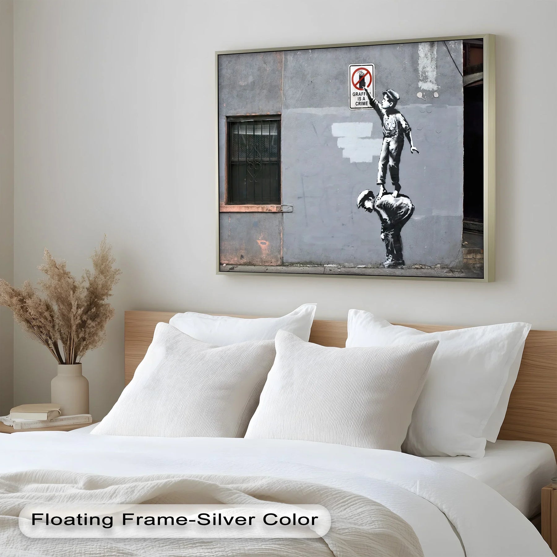 Challenge authority with Climb for Expression, a bold Banksy oil painting that transforms playful mischief into a powerful act of resistance. Two children—innocent yet daring—work together to defy the rules, as one climbs on the other's back to alter a “Graffiti Is a Crime” sign. This piece captures the eternal tension between societal control and youthful rebellion.