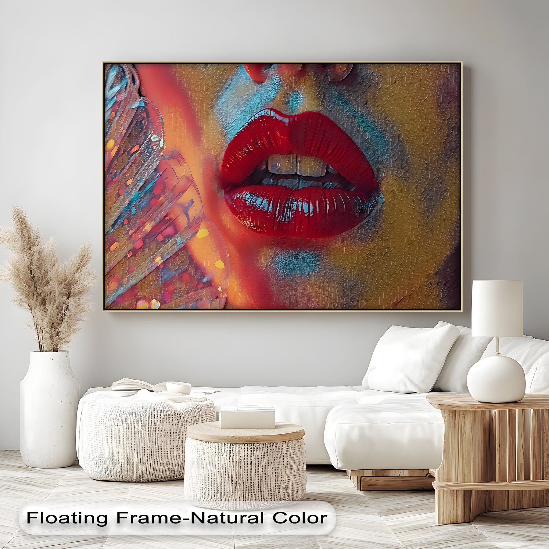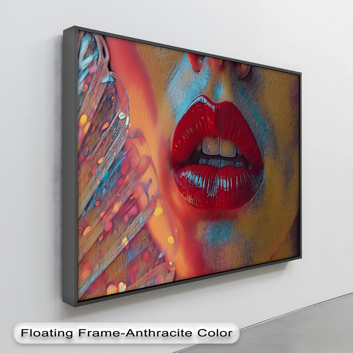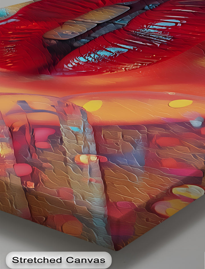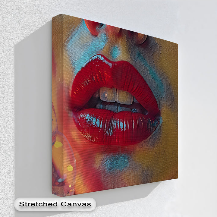 Where temptation flickers like flame—Crimson Heat captures the electric allure of sensuality through a vivid close-up of glossy red lips, parted ever so slightly, inviting your gaze deeper. A soft, colorful fan brushes the frame, adding rhythm and intimacy to this bold erotic canvas wall art.