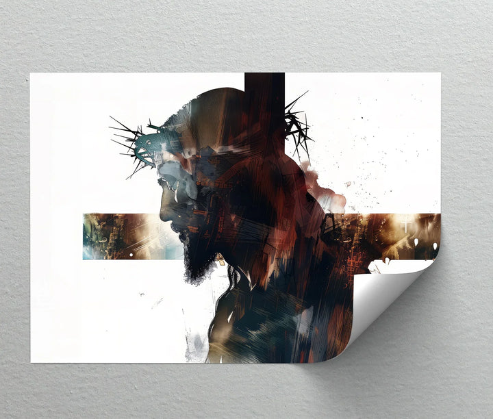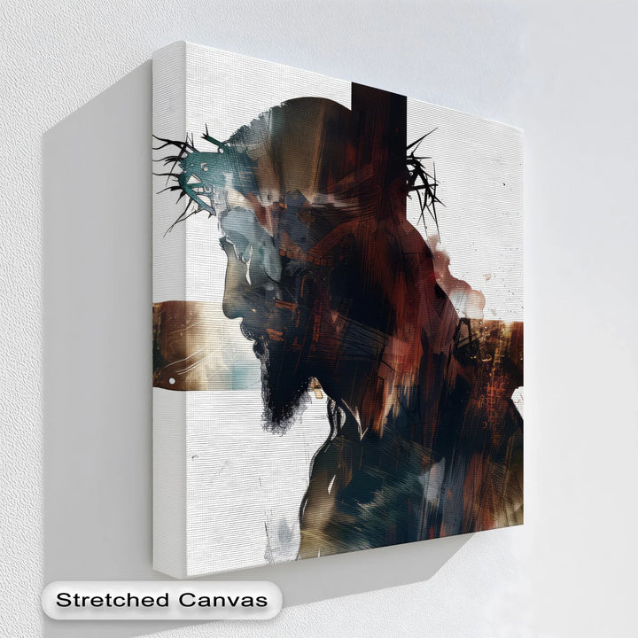 A strikingly modern interpretation of Christ’s sacrifice, this abstract Christian canvas print features the silhouette of Jesus crowned with thorns, merged with deep, moody textures and brushwork. A bold black cross intersects the background, amplifying the emotional gravity and spiritual symbolism of the crucifixion. The dark hues and layered collage-like structure evoke reflection, sorrow, and redemption all at once.