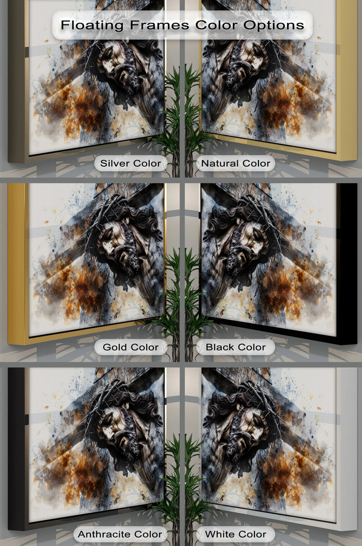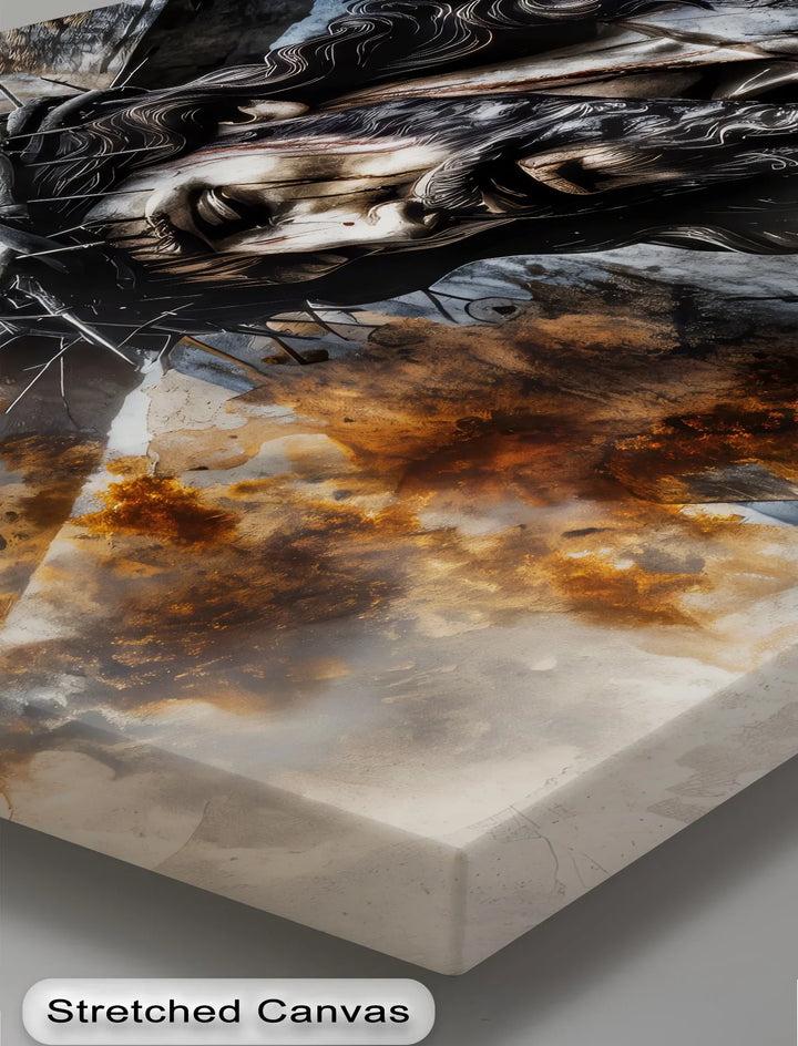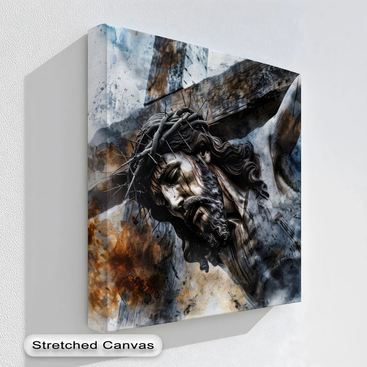 This emotionally stirring canvas print captures the final sacrifice of Jesus Christ, crowned with thorns and nailed to the cross. Rendered in deep, textured brushstrokes with a blend of smoky blues, rusted browns, and dramatic light, the piece evokes pain, love, and redemption in one profound image.