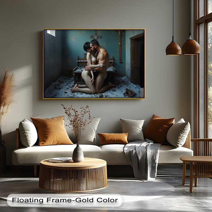 Step into a scene where sacred decay and raw connection merge with Devotion in Ruin, a powerful piece of erotic canvas wall art. This emotional framed canvas wall art captures two lovers locked in an intimate embrace amid the ruins of a forgotten chapel—where affection, abandonment, and faith converge.