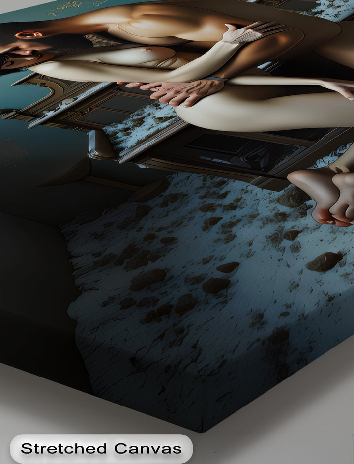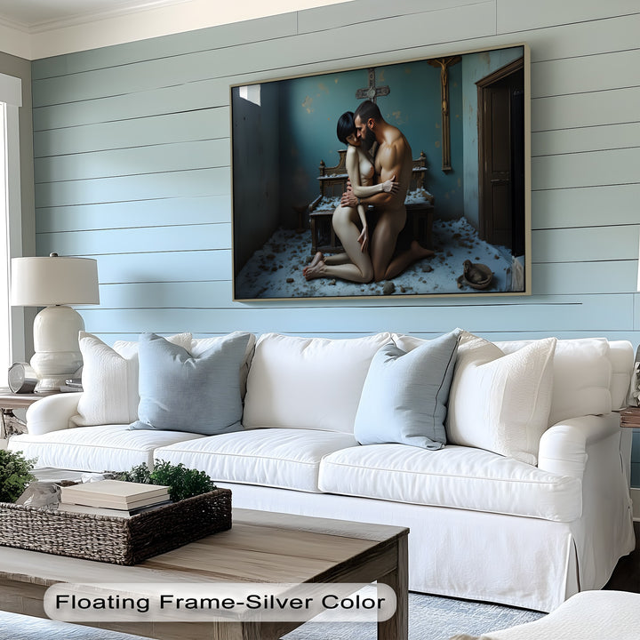 Printed on museum-quality canvas, this large canvas art print blends abstract art with sensual narrative, perfect for moody and dramatic interiors. The snow-dusted floor, worn altar, and muted teal backdrop create a haunting contrast to the couple’s warm, intertwined forms—symbolizing comfort in chaos and love beyond sanctuary.