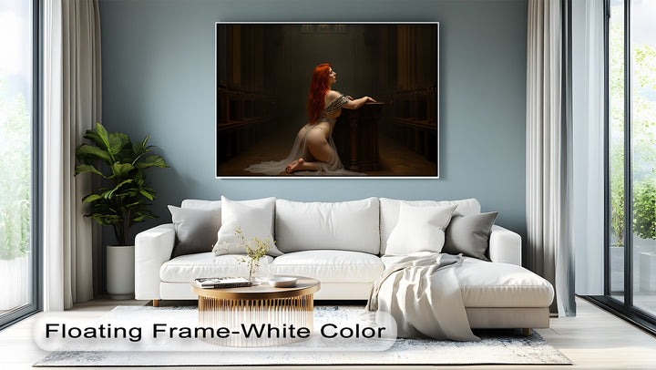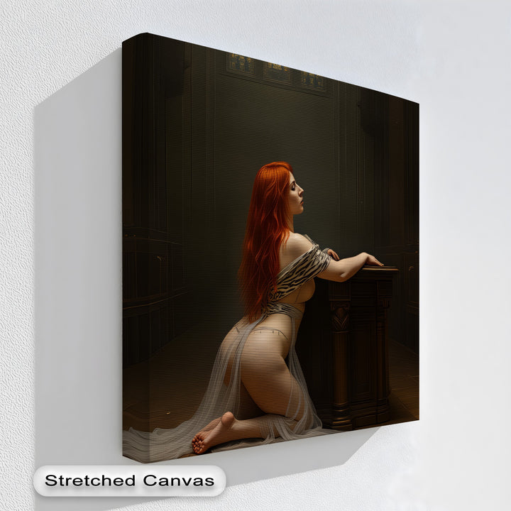 Experience sacred sensuality with Divine Longing, a moody erotic canvas wall art piece set in the quiet stillness of a gothic cathedral. A flame-haired woman kneels at an altar, draped in flowing fabric and bathed in the soft glow of candlelight—her posture poised between surrender and strength. This emotionally evocative artwork canvas blends themes of reverence, desire, and vulnerability.