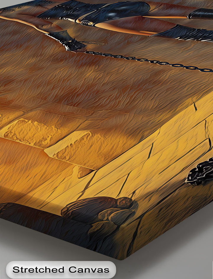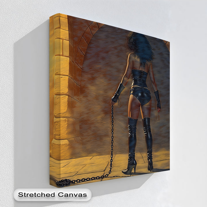 Step into a secret realm of power and seduction with Dungeon Desire, a bold erotic canvas wall art featuring a commanding woman in black leather holding chains in a torch-lit stone corridor. The light flickers across ancient walls, highlighting her silhouette in a blend of dominance and mystery—perfect for collectors of provocative framed canvas art and dark moody canvas prints.
