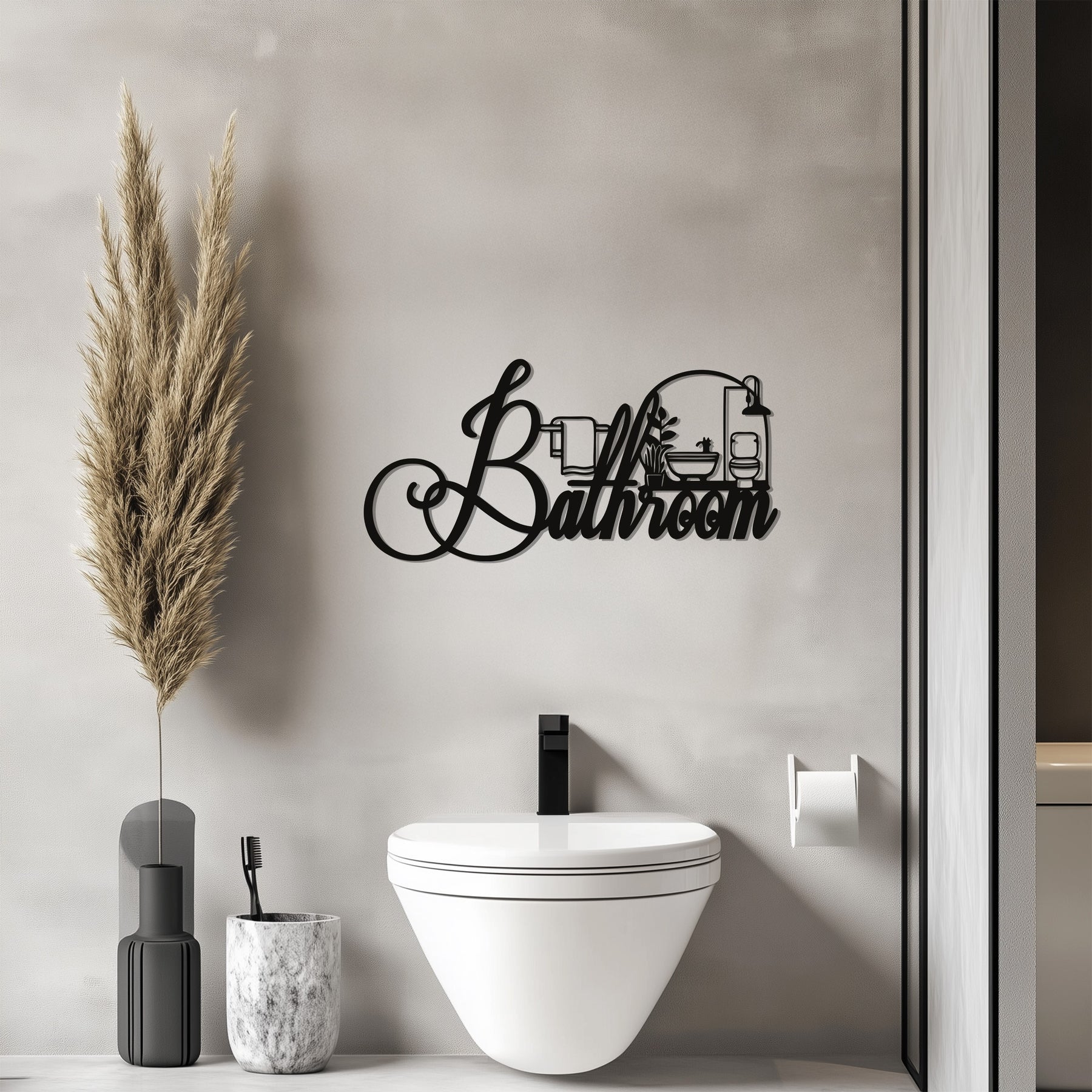 Add a refined touch to your home with the Elegant Script Bathroom – Modern Metal Wall Art Décor. This stunning design blends elegant typography with detailed bathroom elements such as a towel, sink, and lamp, creating a perfect harmony between functionality and style. Ideal for modern, minimalist, or classic interiors, it enhances any bathroom with sophistication.