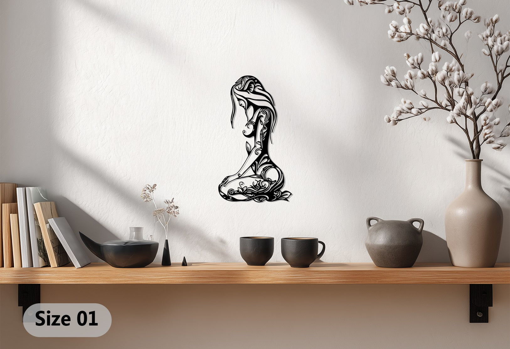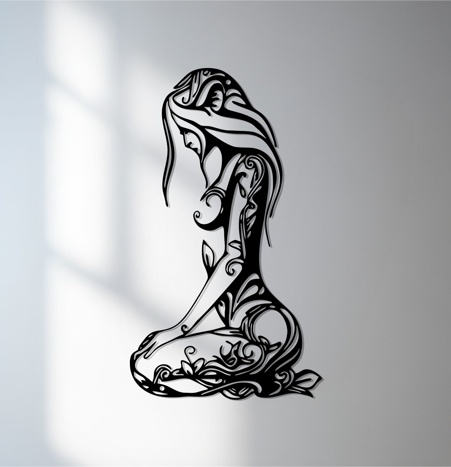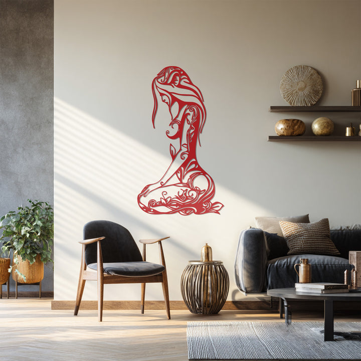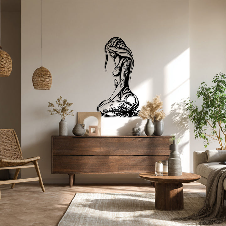 Celebrate feminine grace and natural beauty with the Floral Woman Silhouette Metal Wall Art. This intricate black metal artwork depicts a seated woman whose body is adorned with flowing floral and vine patterns, symbolizing harmony, peace, and inner strength. Perfect for bedrooms, living spaces, yoga studios, or artful hallways, it adds a serene yet powerful presence to any wall.