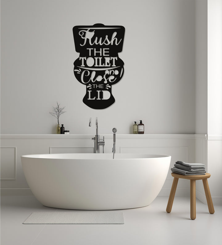 Add humor and hygiene to your bathroom décor with the Flush & Close – Toilet Quote Metal Wall Art Sign. Designed in the playful shape of a toilet, this wall art reminds everyone to “Flush the Toilet, Close the Lid” in a fun yet elegant way. Its creative typography and smooth black metal finish bring character and function together — perfect for both modern and rustic interiors.