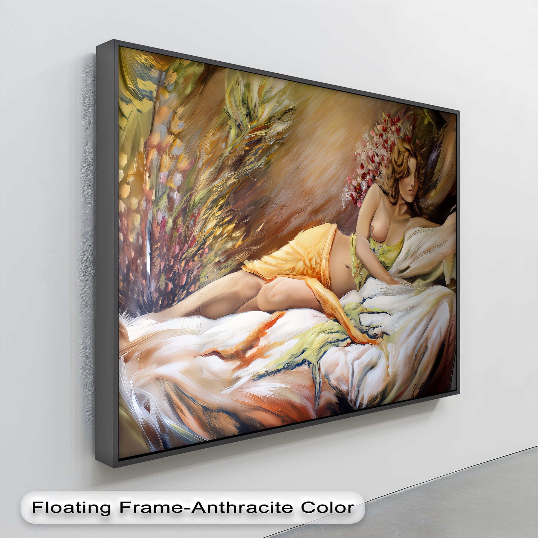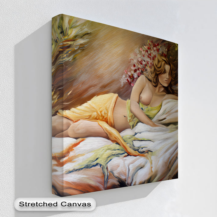 Golden Bloom captures a moment of timeless allure, where a reclining muse rests among a bed of petals and golden light. Her body, partially draped in flowing amber and sage fabrics, melts into painterly strokes of warmth and floral elegance. This sensual canvas wall art whispers softness, mystery, and natural beauty—inviting reflection and admiration.