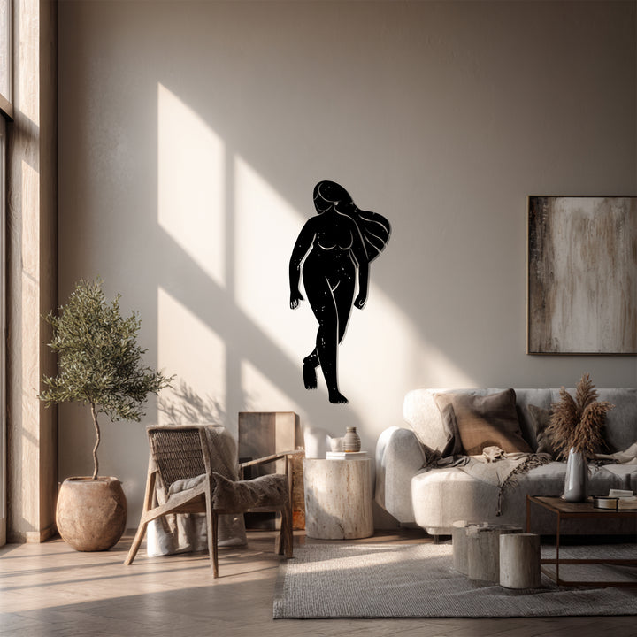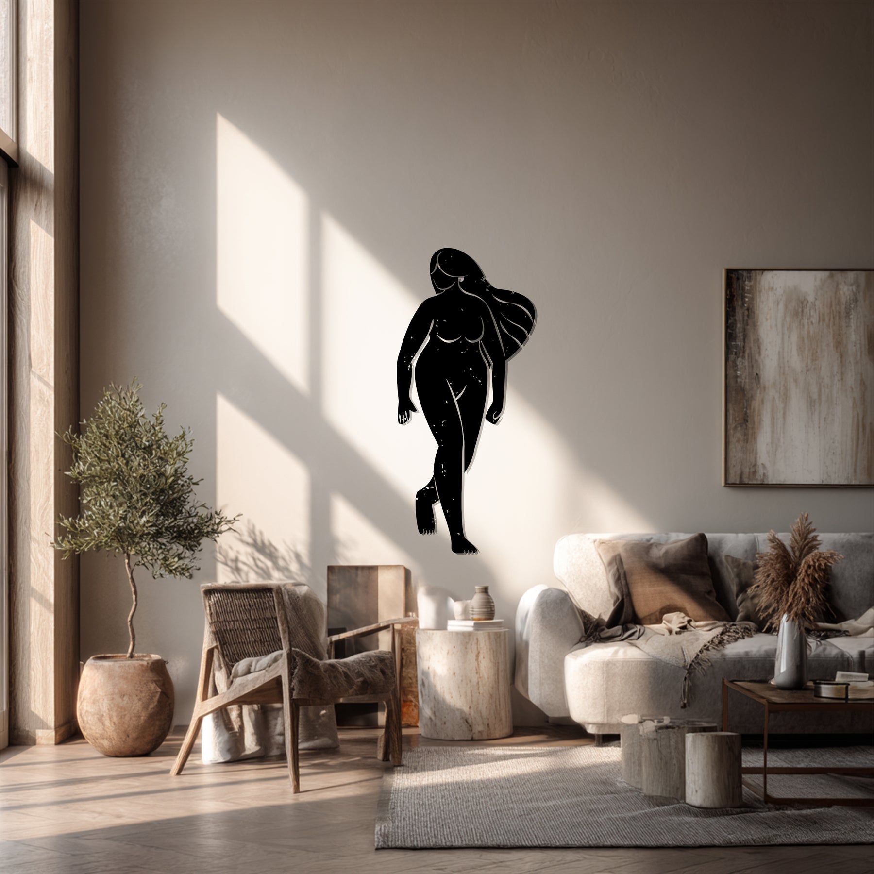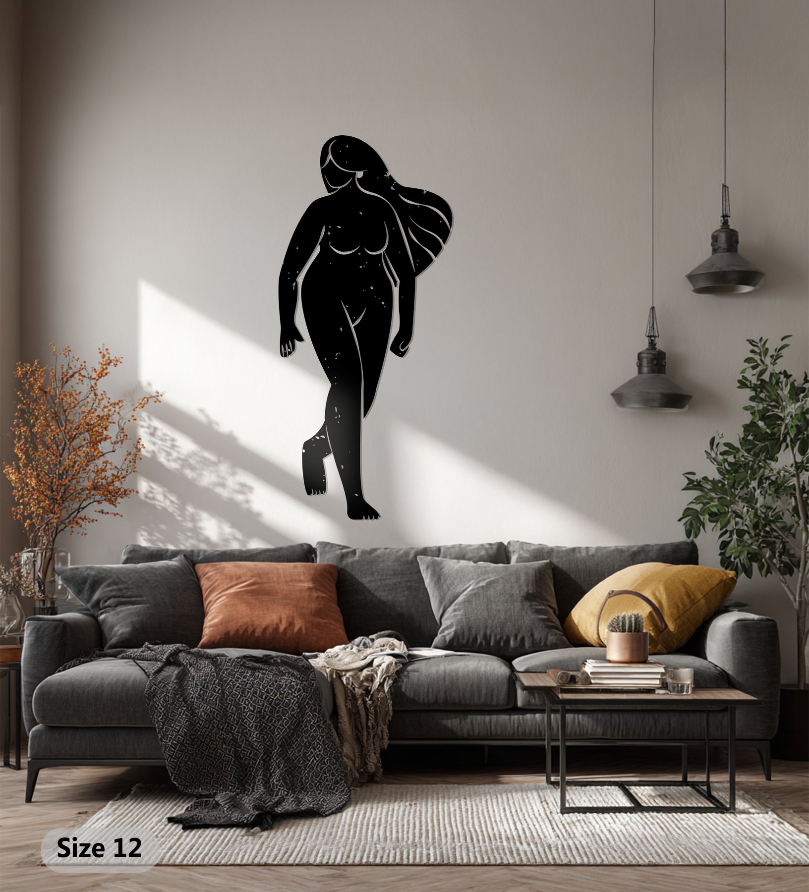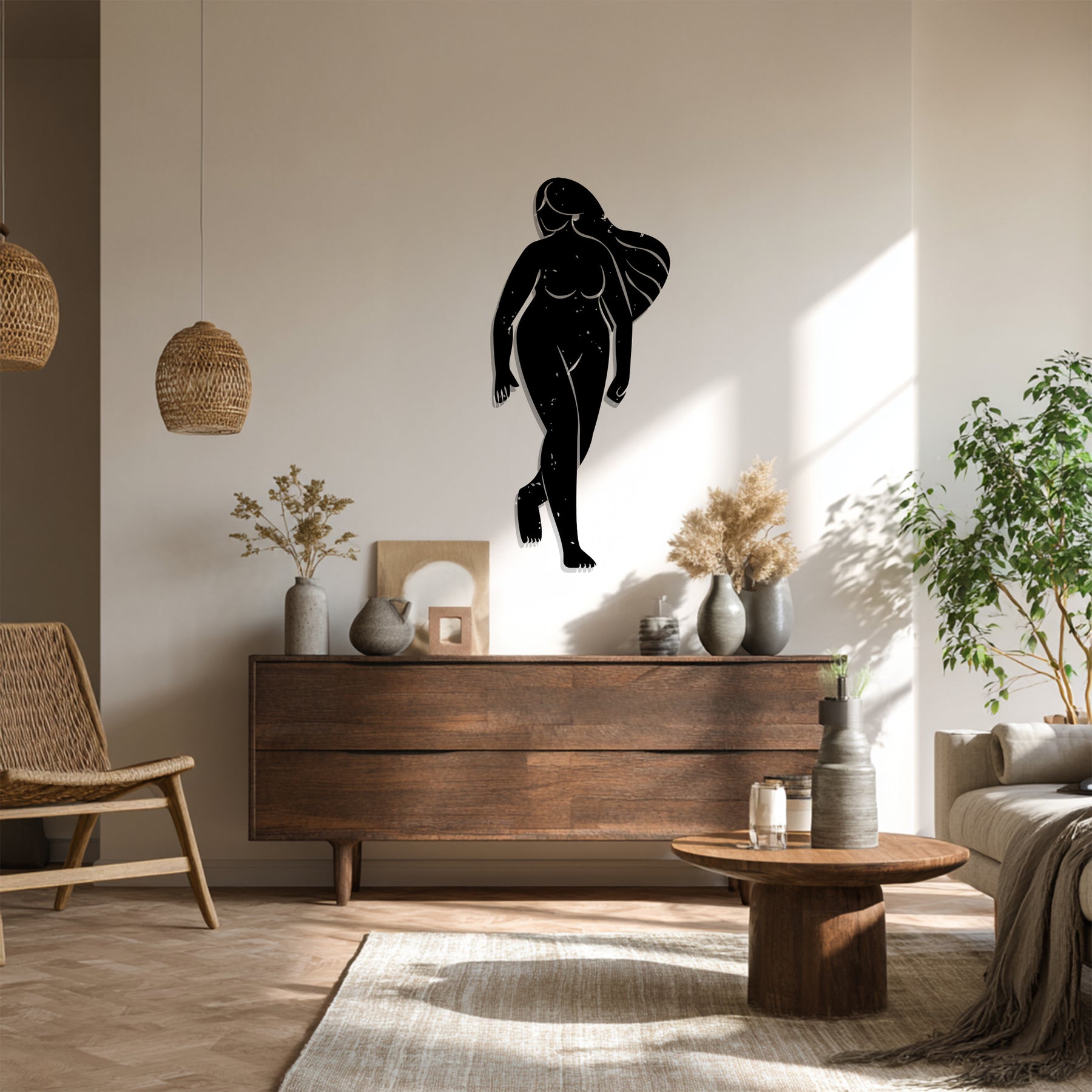 Celebrate the beauty of form and confidence with the Golden Female Silhouette Metal Wall Art, a minimalist yet powerful representation of feminine grace. The artwork showcases a flowing, natural figure in radiant gold tones, delicately contoured with subtle black accents — exuding warmth, empowerment, and modern elegance.
