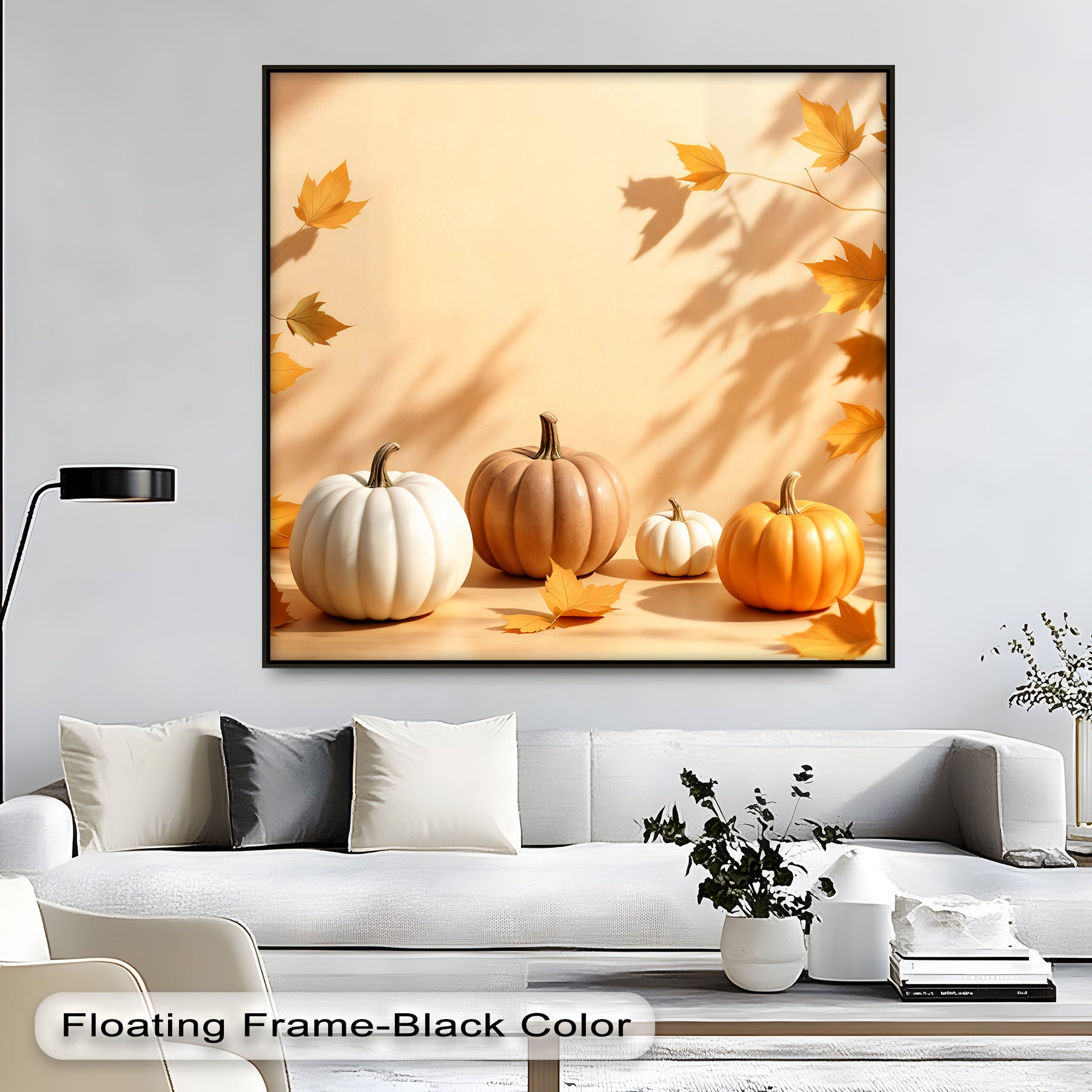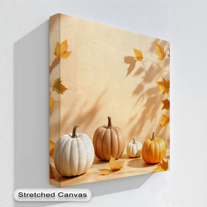 Bring the essence of autumn indoors with Golden Harvest, a minimalist pumpkins canvas wall art that radiates seasonal warmth. Featuring a refined arrangement of white, tan, and orange pumpkins surrounded by golden fall leaves, this artwork blends simplicity with elegance. The soft neutral background enhances the natural hues, creating a cozy yet modern seasonal piece.