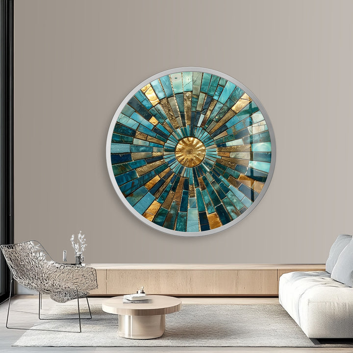 Golden Horizon – Turquoise Mosaic Round Glass Wall Art