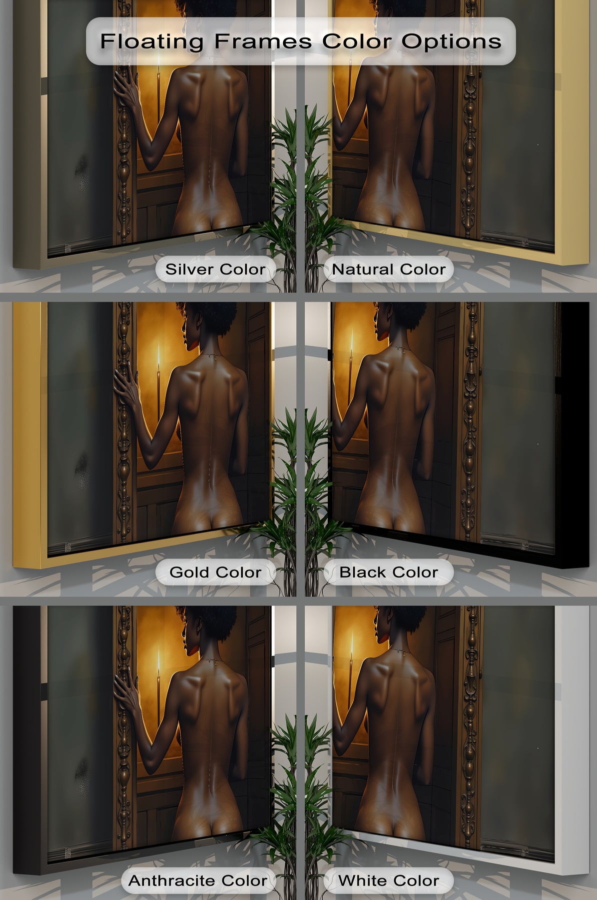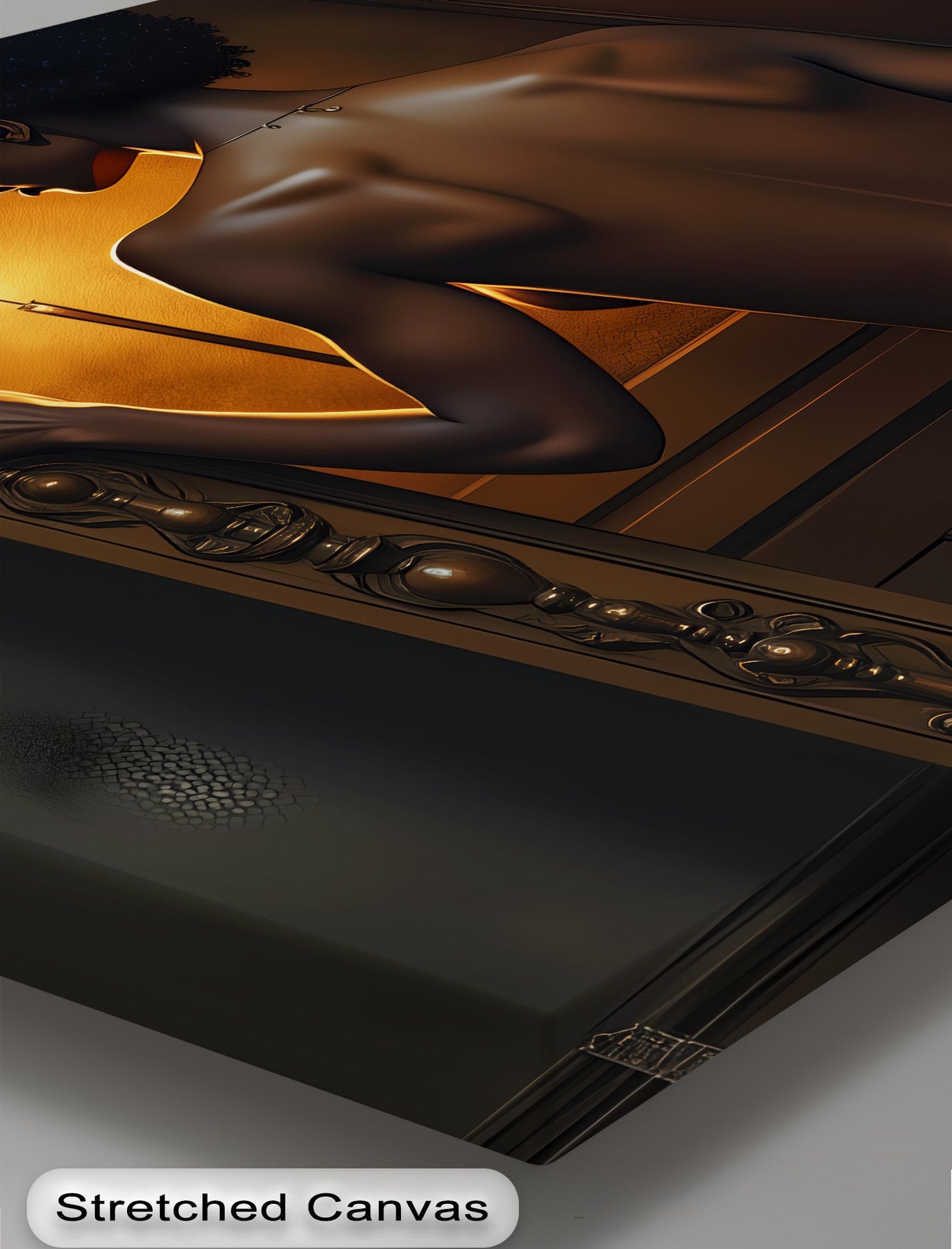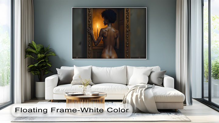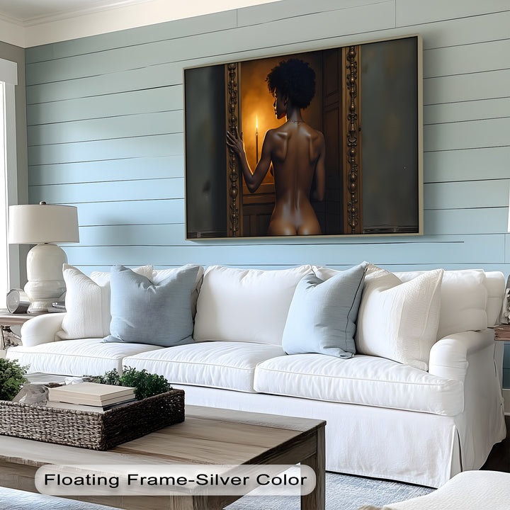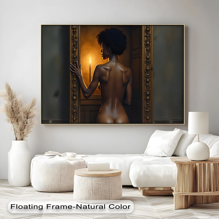 This evocative canvas print captures the silhouette of a graceful Black woman standing nude before a single lit candle, her form glowing with the warmth of golden illumination. Her pose is both powerful and intimate, framed by an ornate wooden structure that hints at classic architecture and timeless elegance.