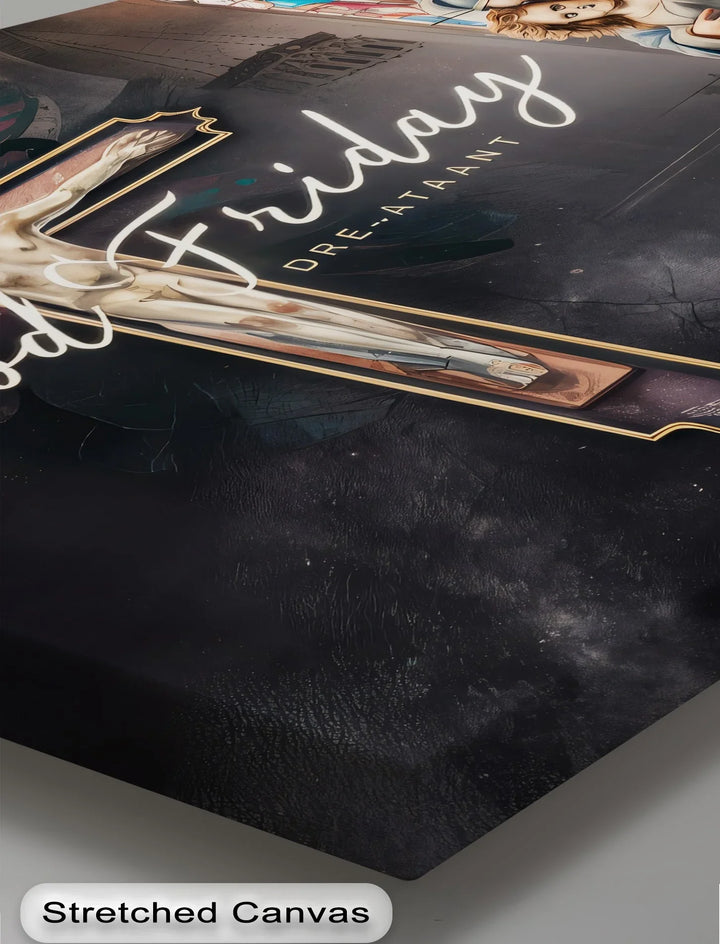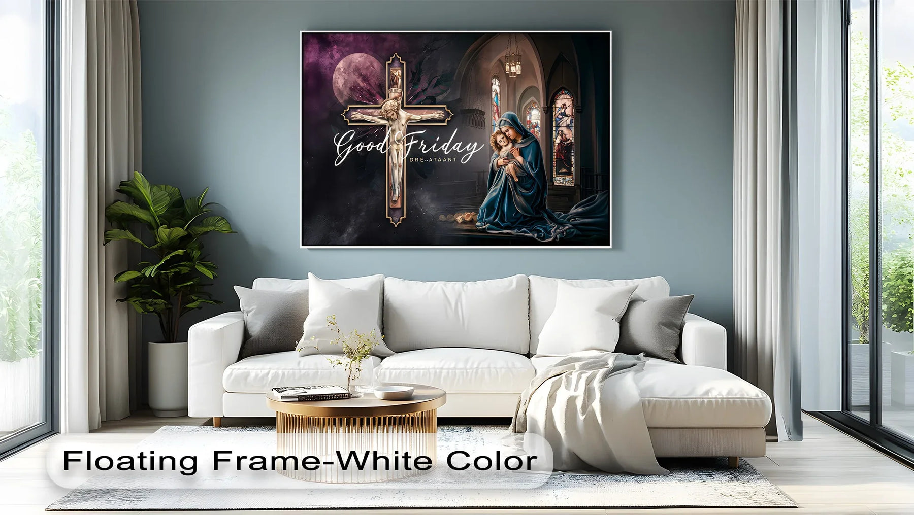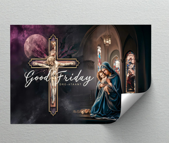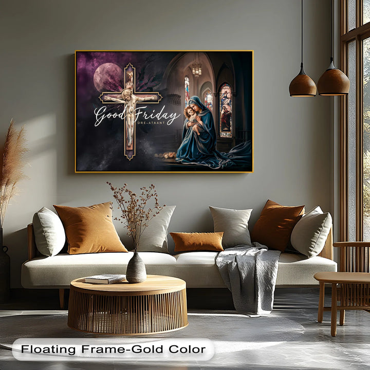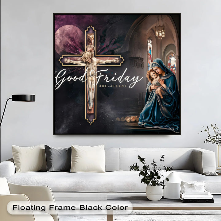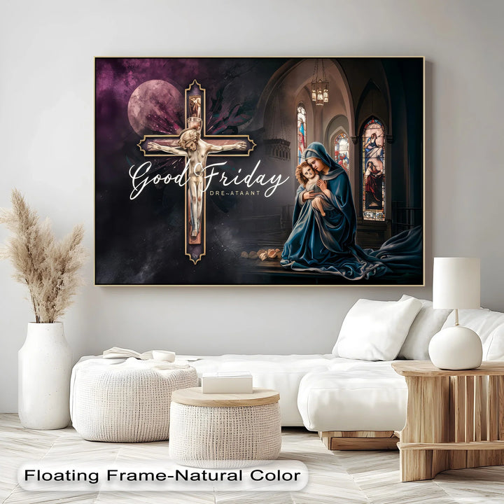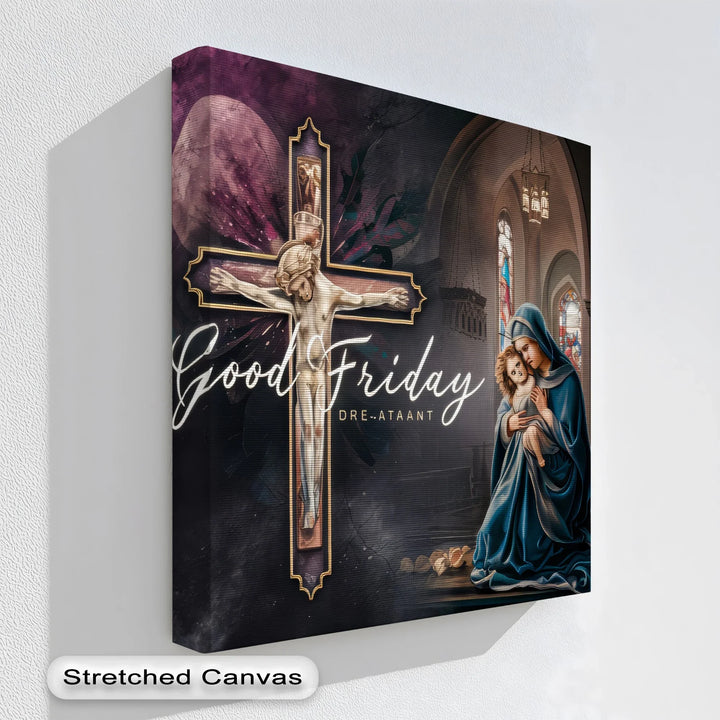 This spiritually moving canvas print captures the profound sorrow and sacred beauty of Good Friday. On the left, a gilded cross frames the crucified Christ, set against a celestial backdrop of deep purples and textured night sky. On the right, a solemn Virgin Mary cradles the Christ Child in a quiet chapel surrounded by luminous stained-glass windows, honoring the journey from birth to sacrifice.