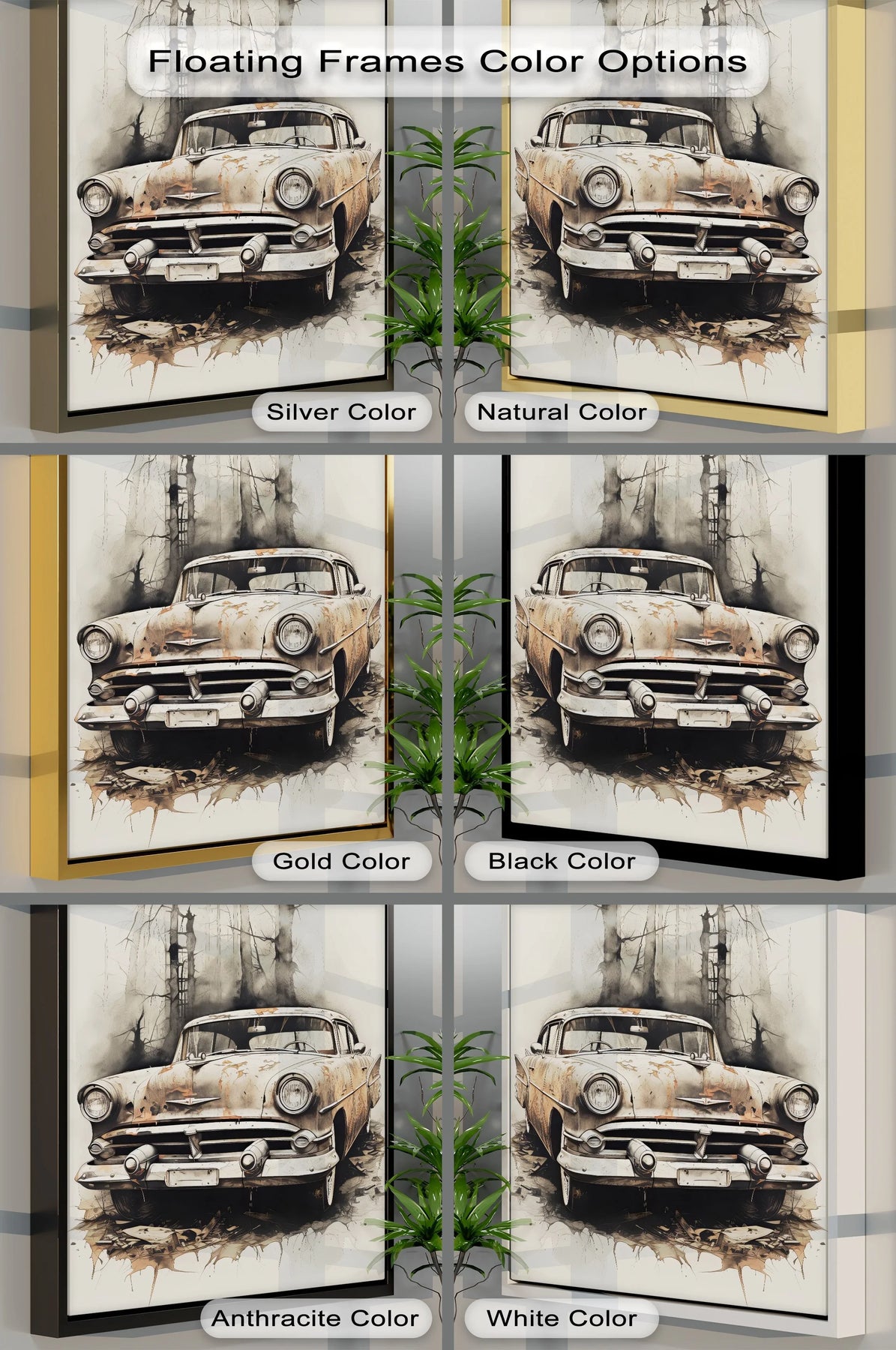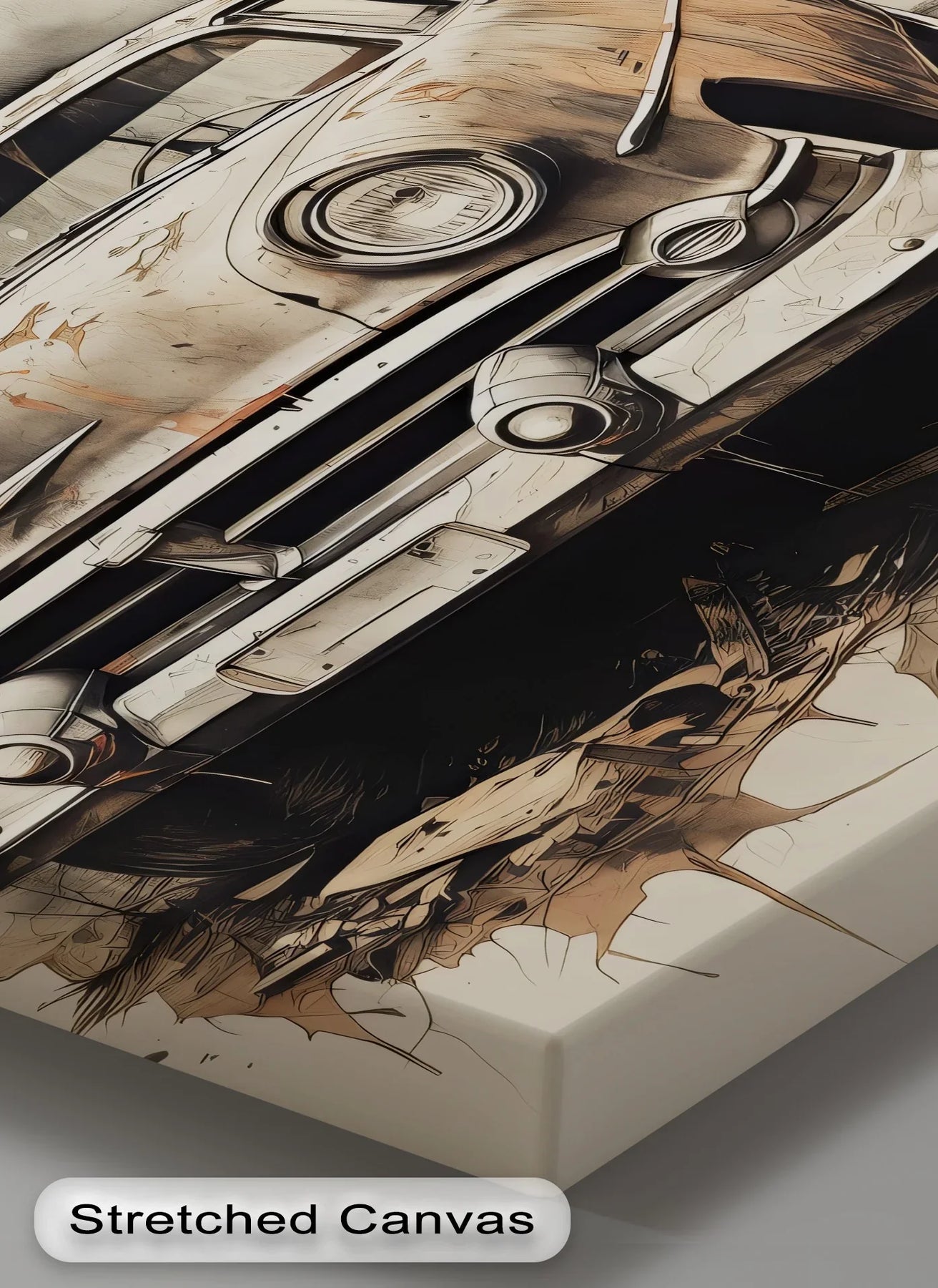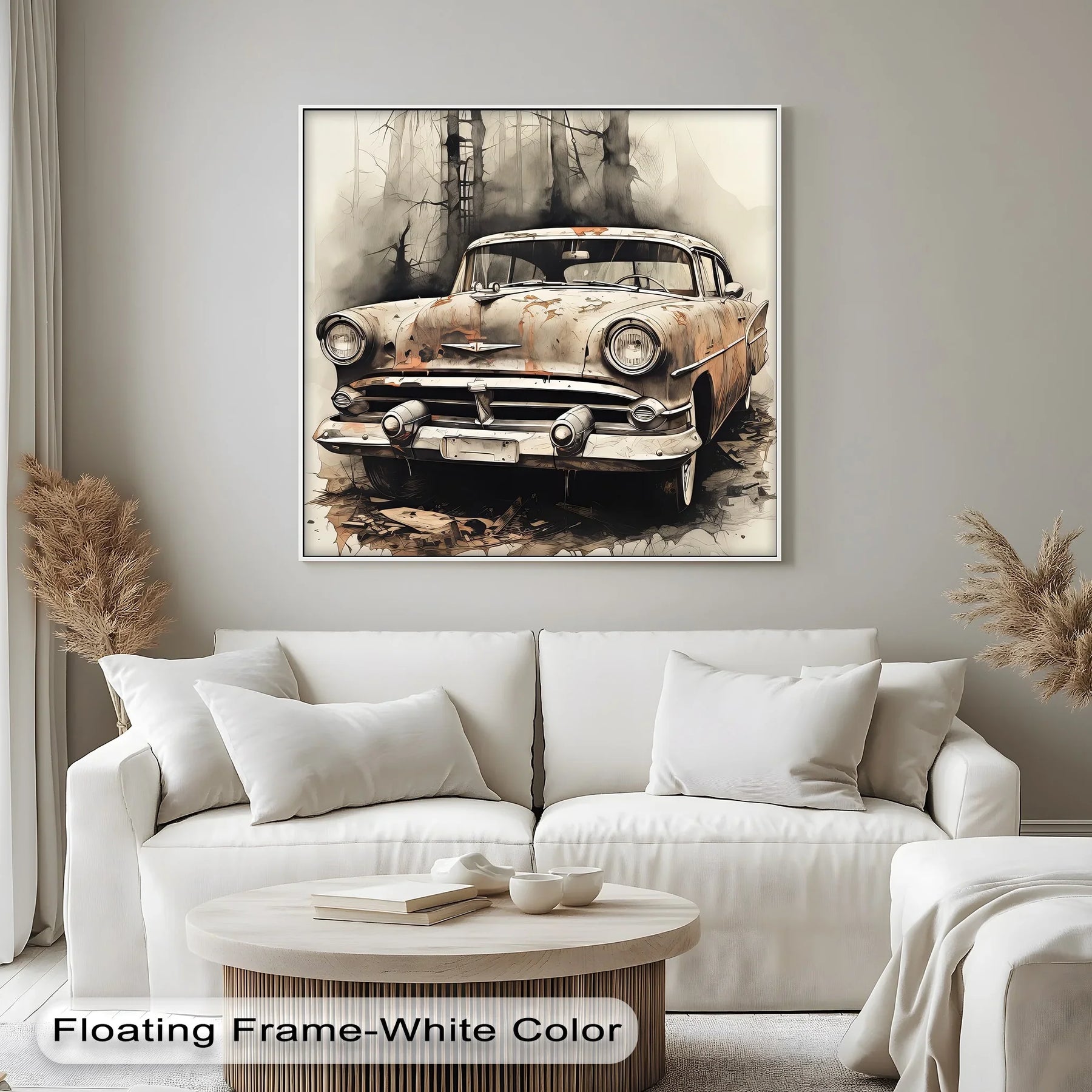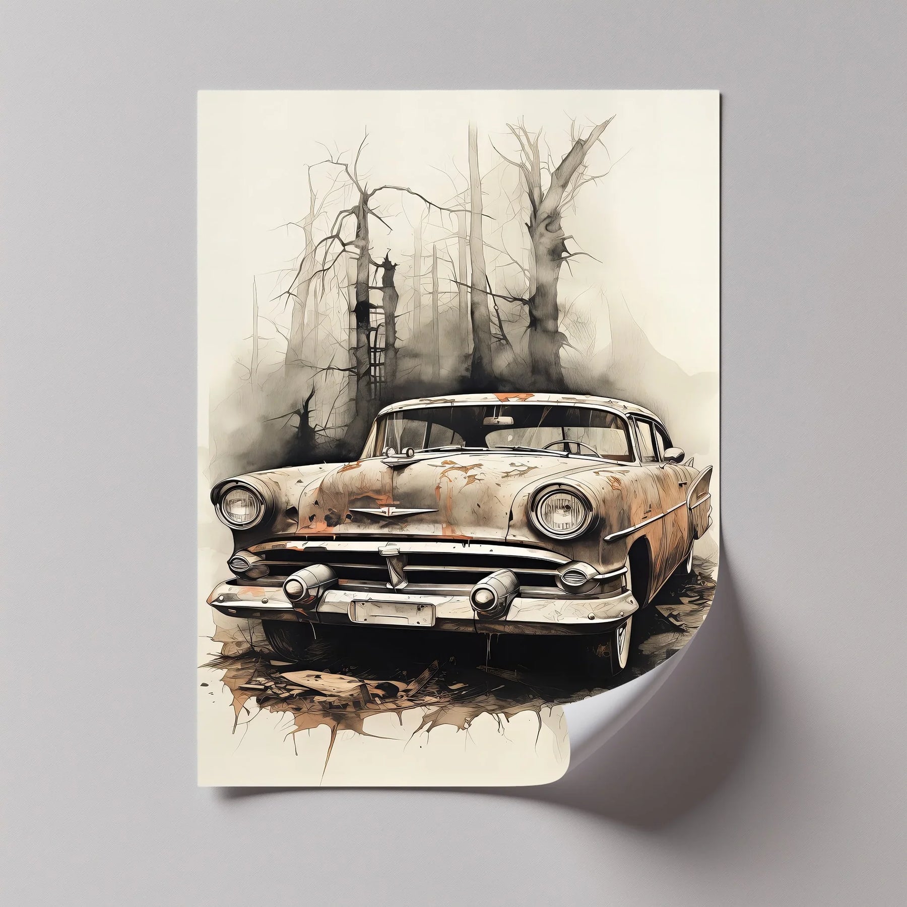 This dramatic car canvas print captures a rusted vintage vehicle emerging from a haunting forest scene, with bare trees silhouetted against a foggy sky. The decaying beauty of the car and the eerie woodland setting evoke mystery, resilience, and a love for forgotten roads. A moody and powerful wall accent for industrial and rustic spaces.
