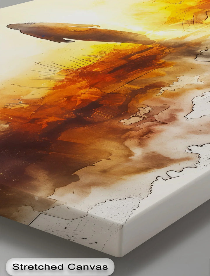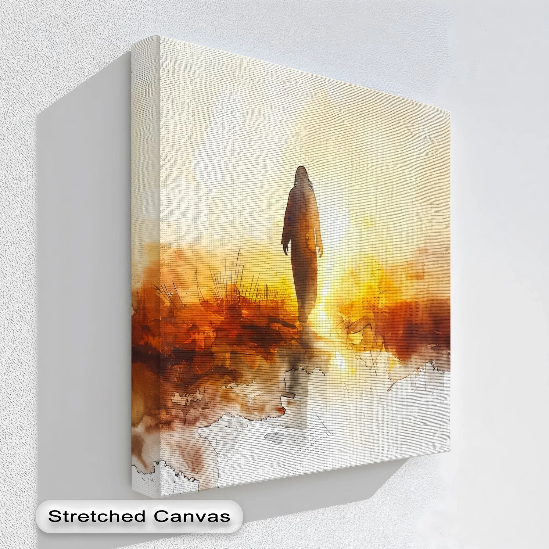 A breathtaking spiritual canvas print capturing the serene silhouette of Jesus walking into radiant light across an abstract desert horizon. The fiery golds, warm browns, and soft whites blend in a watercolor-like composition, symbolizing divine presence, hope, and redemption. The image evokes a sense of journey, purpose, and eternal peace.