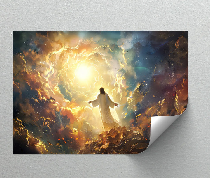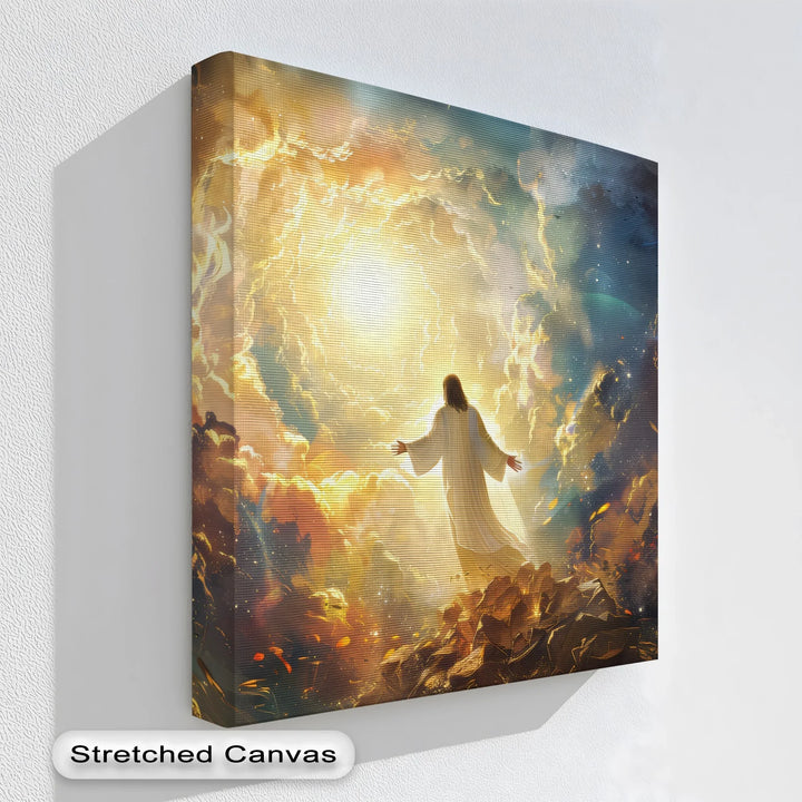 This breathtaking canvas print captures a divine moment of spiritual transcendence—Jesus standing atop broken earth, arms open, gazing toward a brilliant celestial light that pierces through a swirl of radiant clouds. The scene is painted with ethereal tones of gold, sapphire, and fiery crimson, symbolizing heaven’s glory and eternal hope. This inspirational masterpiece invites reflection on resurrection, divinity, and peace.