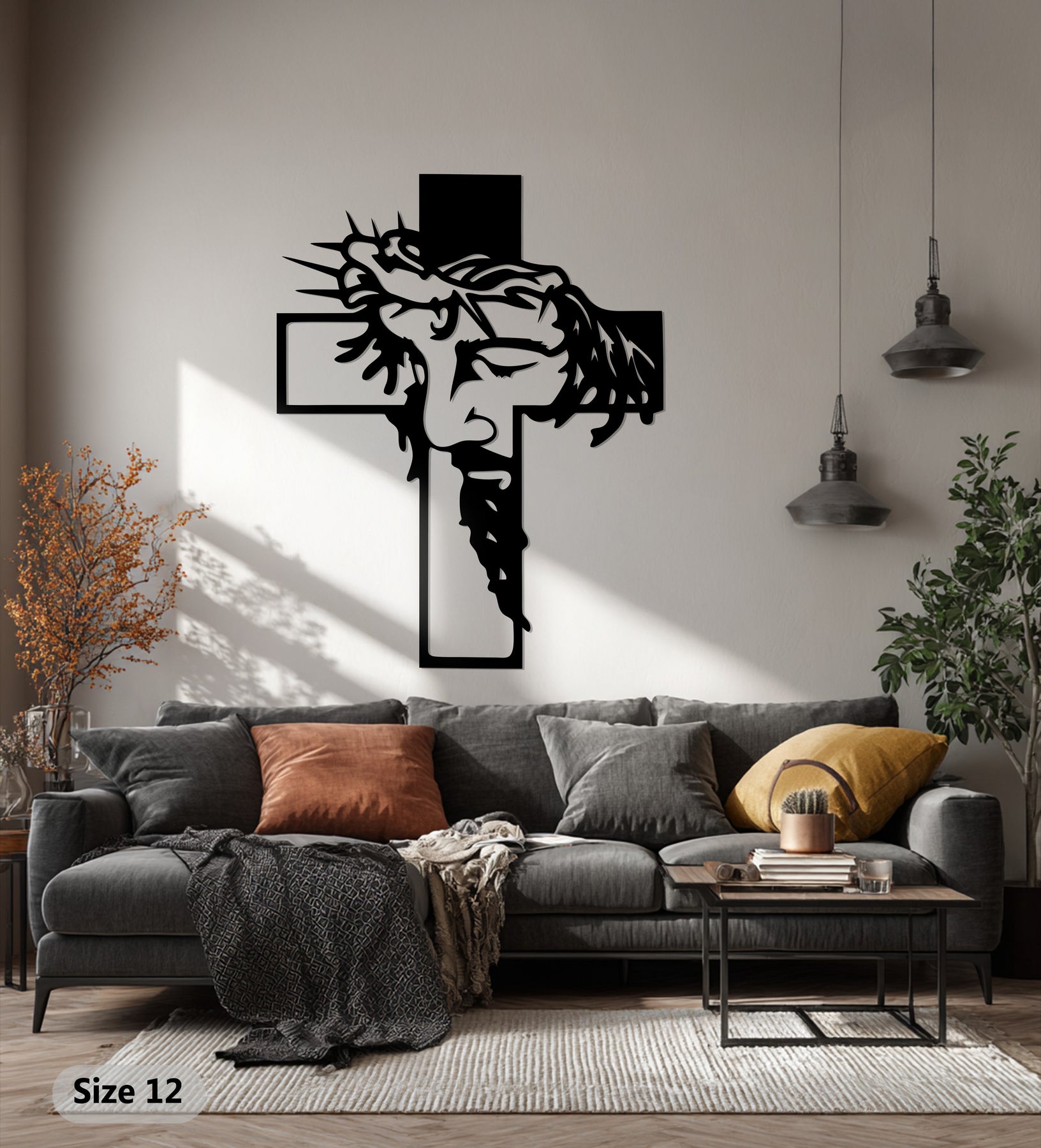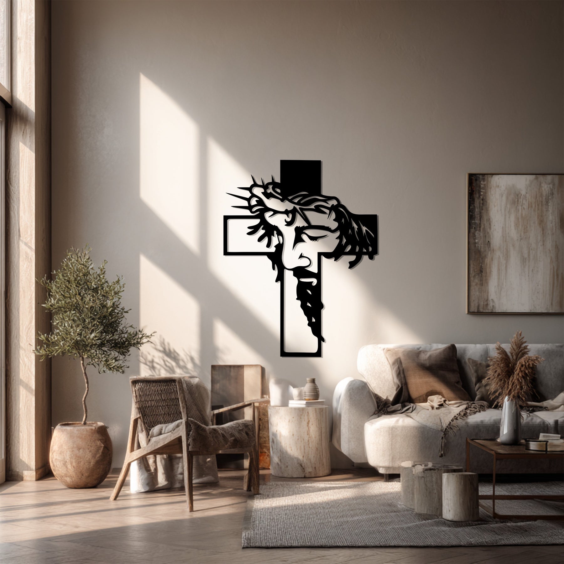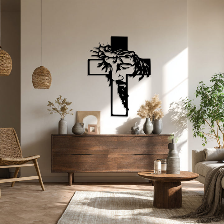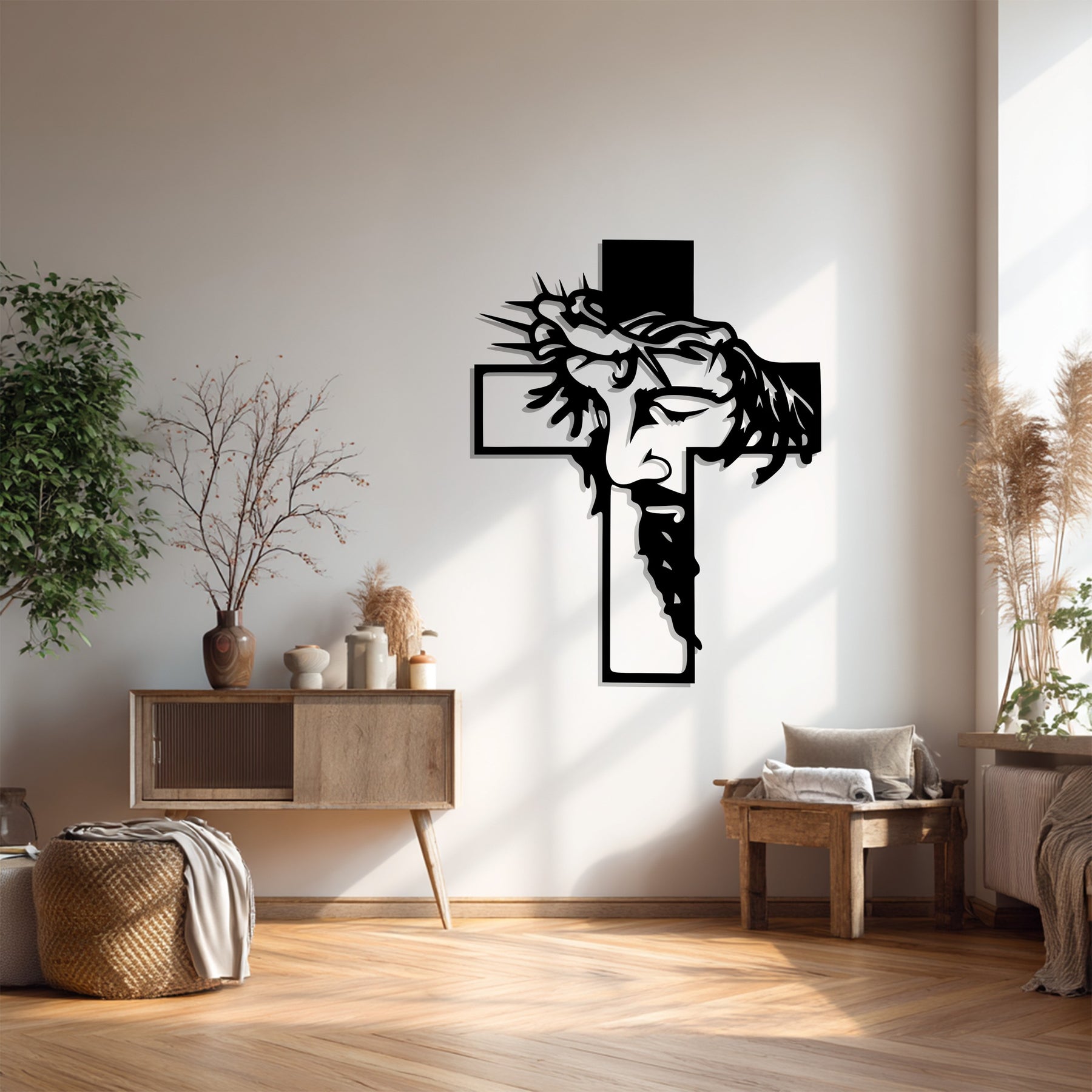 Honor divine sacrifice and devotion with the Jesus Crown of Thorns Metal Wall Art. This powerful design captures the face of Jesus within a cross, symbolizing faith, strength, and eternal grace. Crafted in bold black metal, it blends timeless religious symbolism with modern elegance, perfect for prayer rooms, entryways, or living spaces that embrace spiritual serenity.