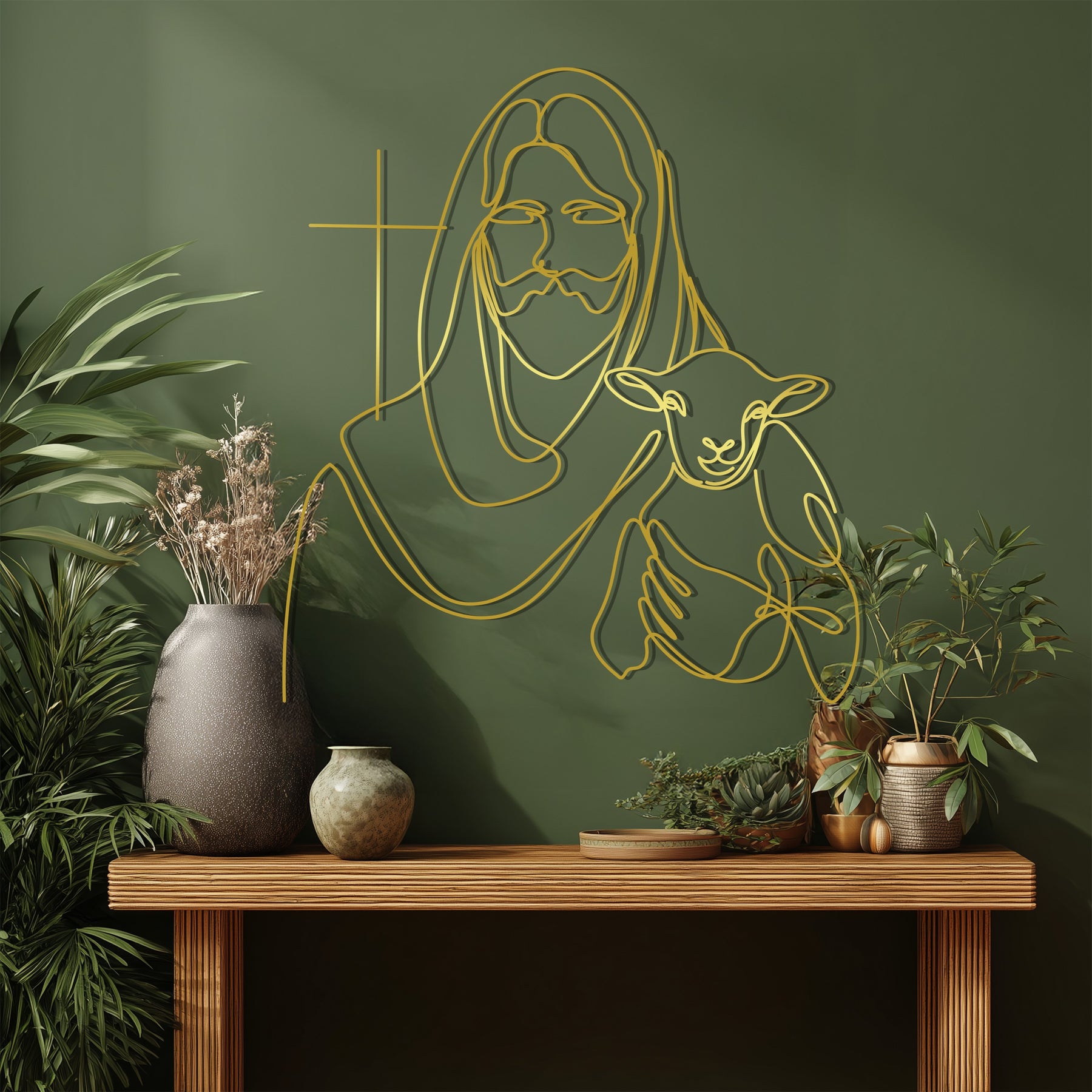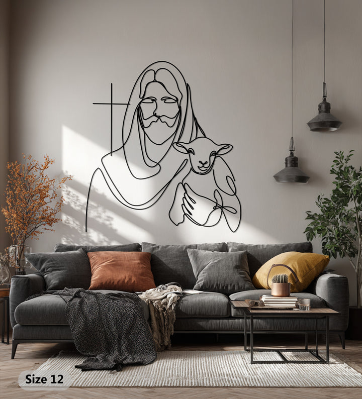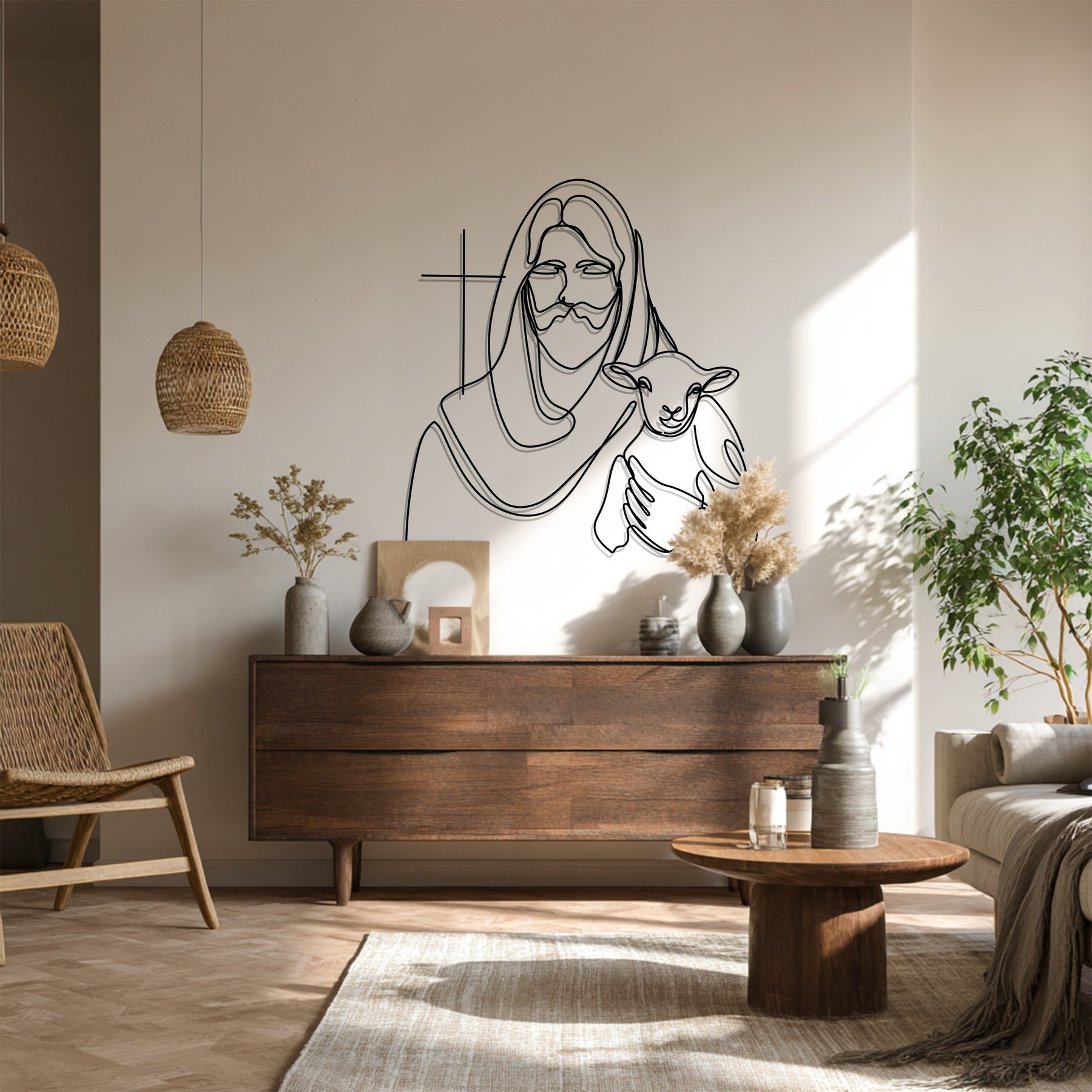 Grace your walls with serenity and faith through the Jesus with Lamb Minimalist Metal Wall Art. Designed with elegant continuous line artistry, this piece captures the tenderness of Jesus holding a lamb — a timeless symbol of compassion, purity, and divine care.