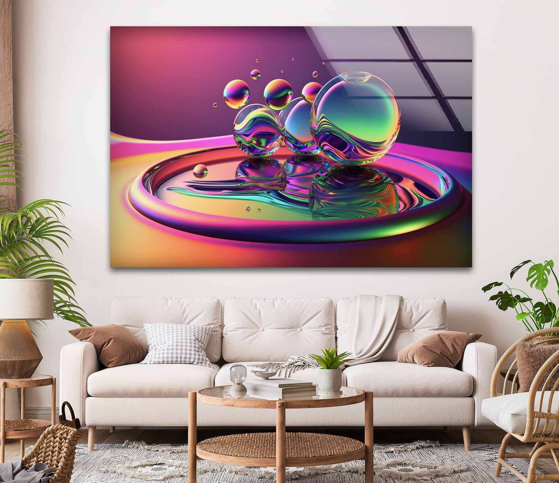 Transform your interior into a surreal futuristic gallery with Luminous Orb Cascade – Neon Chromatic Sphere Sculpture Glass Wall Art. This striking artwork features floating iridescent spheres resting on a liquid-like mirrored surface, radiating hues of emerald, magenta, violet, cyan, and electric gold. Each sphere reflects its environment with mesmerizing clarity—creating a hypnotic, gravity-defying visual that instantly elevates any modern space.