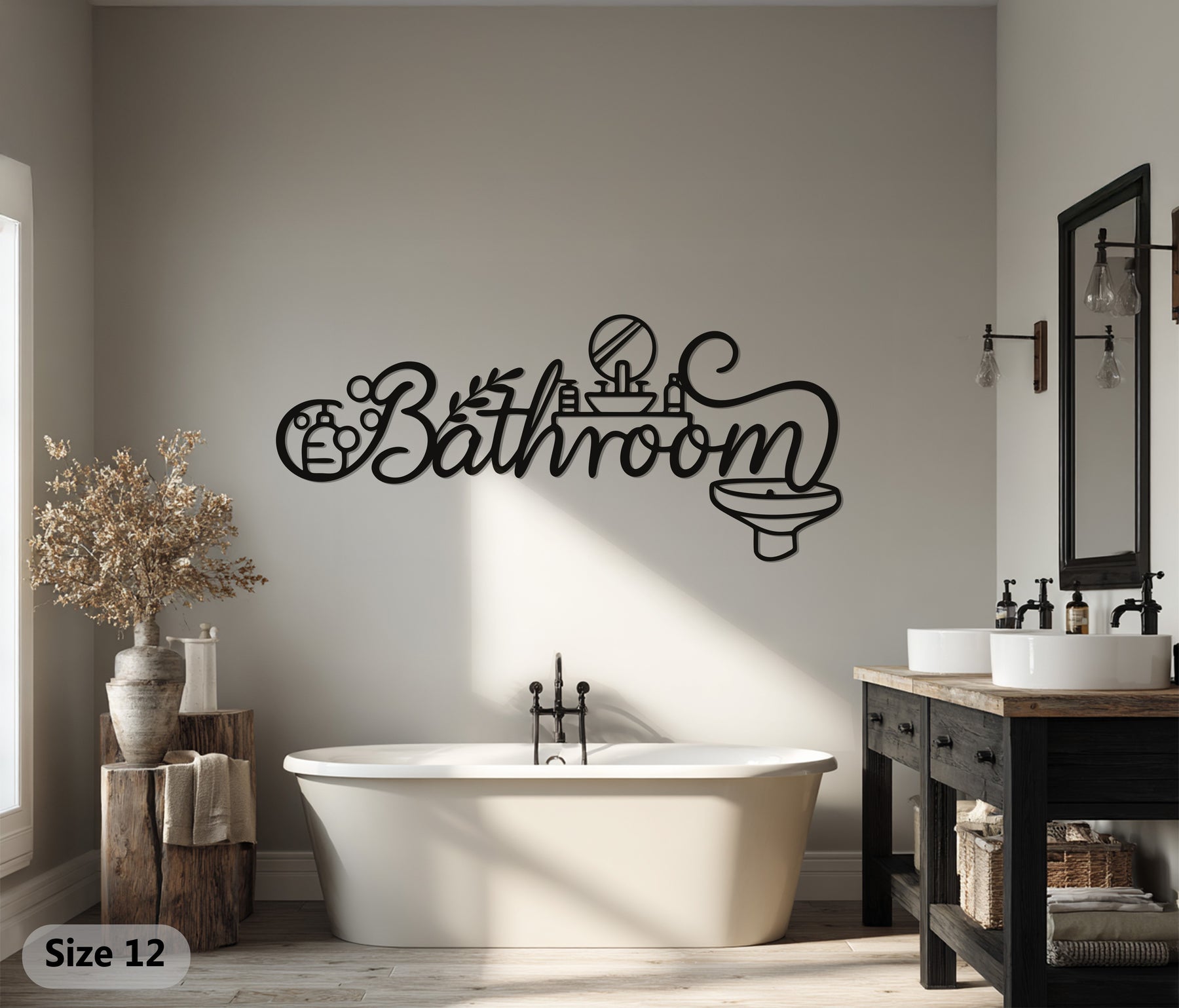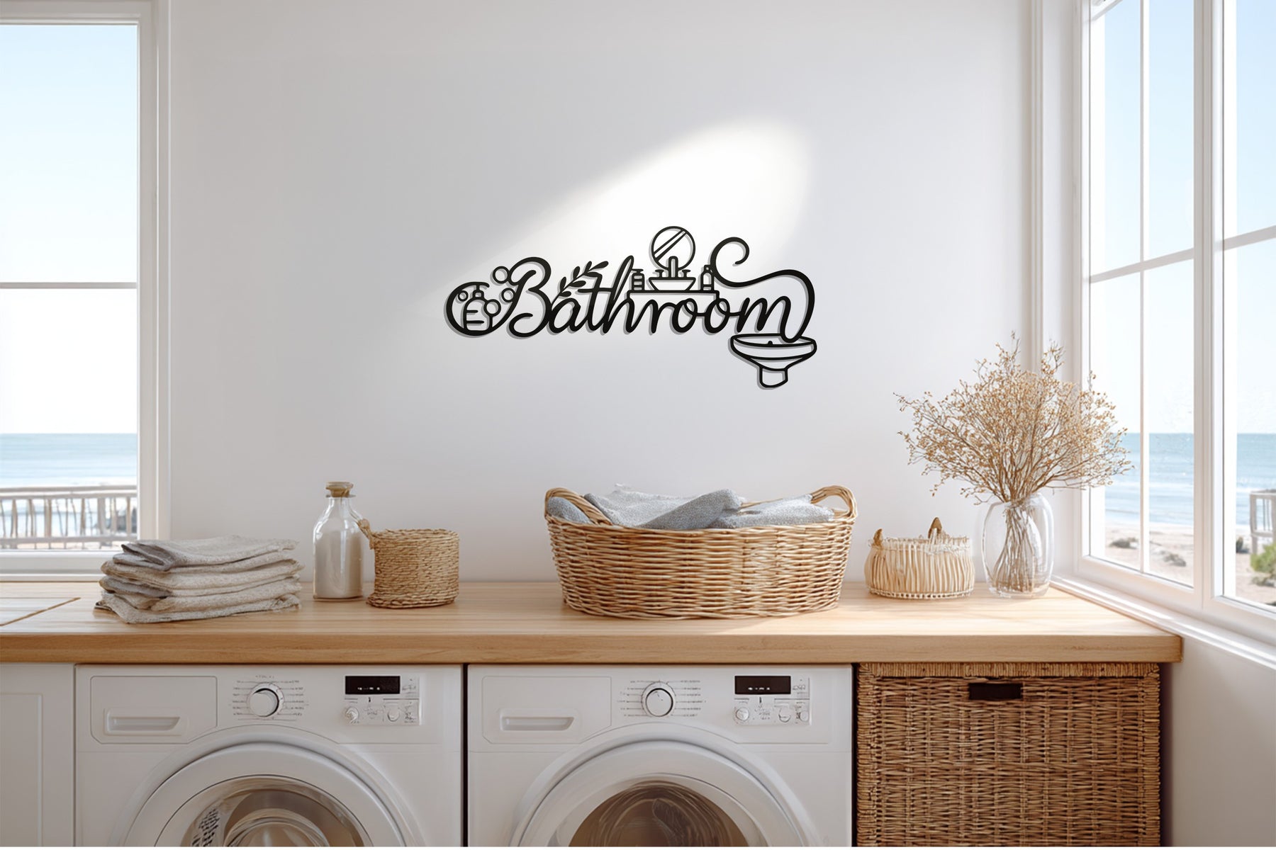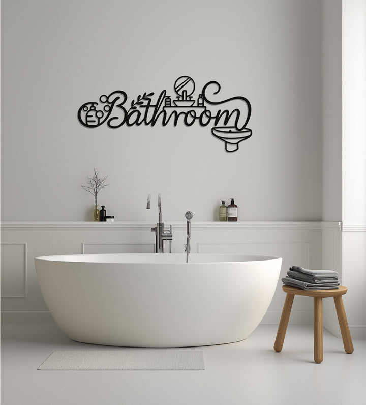 Enhance your bathroom with the Luxury Bathroom Line Art – Modern Metal Wall Décor, a stunning combination of artistic typography and minimalist design. The elegant cursive “Bathroom” text is paired with intricate line icons — including a mirror, sink, faucet, and bubbles — creating a sleek, contemporary aesthetic. Perfect for modern homes, hotels, or spas, this design transforms a functional space into a stylish statement.