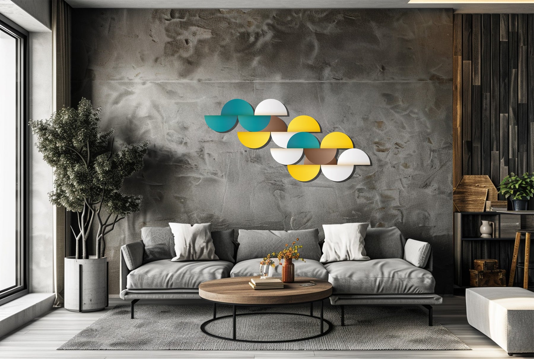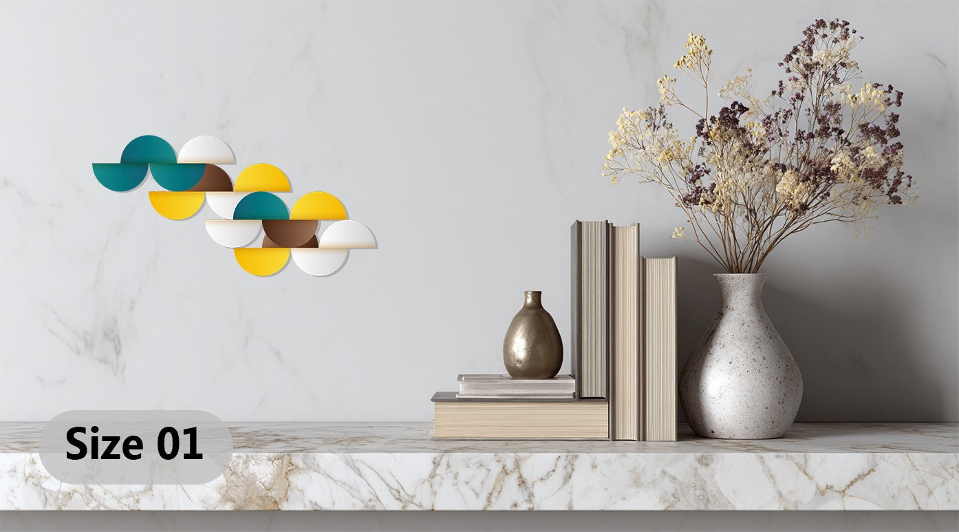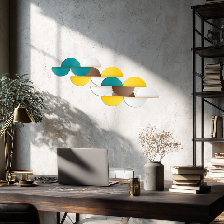 Bring a balance of simplicity and sophistication to your home with the Modern Geometric Circles Metal Wall Art, a perfect harmony of shape, color, and design. Featuring an elegant arrangement of semi-circles in teal, yellow, brown, and white tones, this piece adds a refreshing touch of abstract minimalism to modern interiors, offices, or living spaces.
