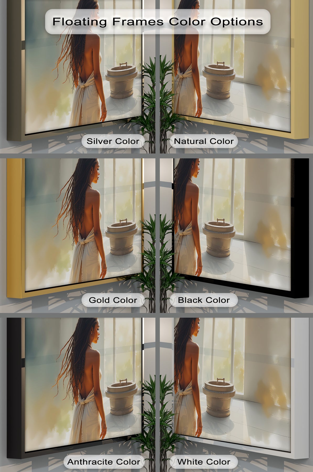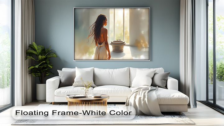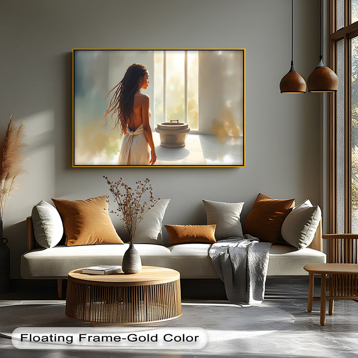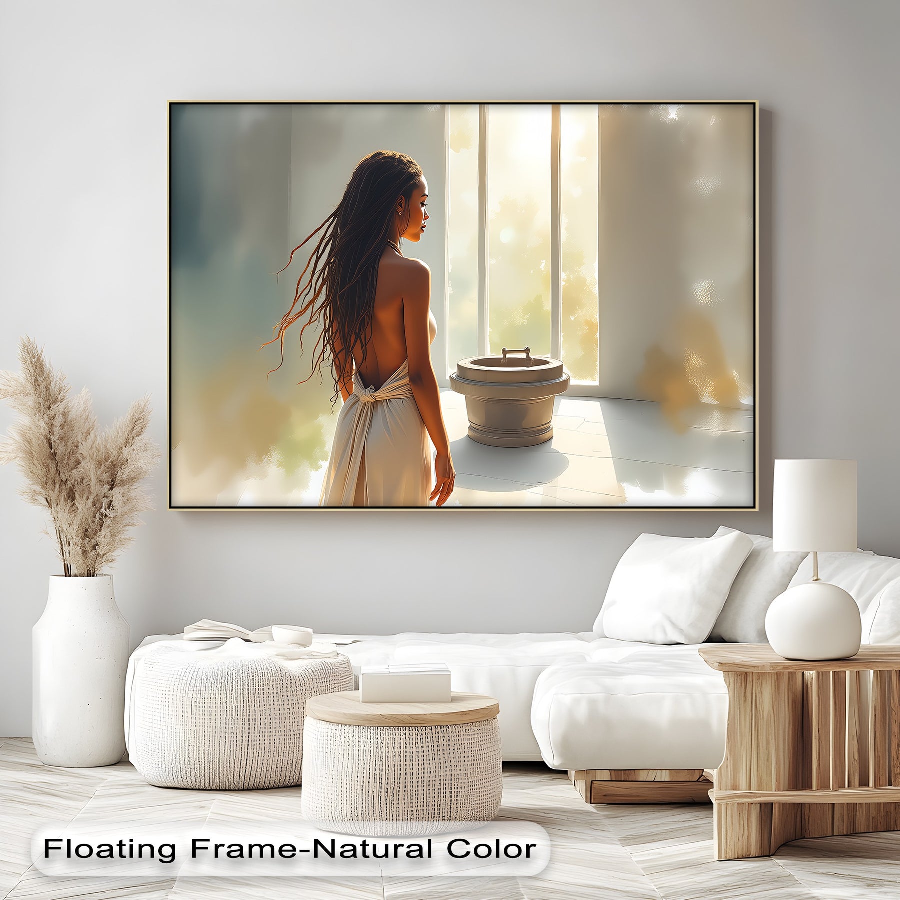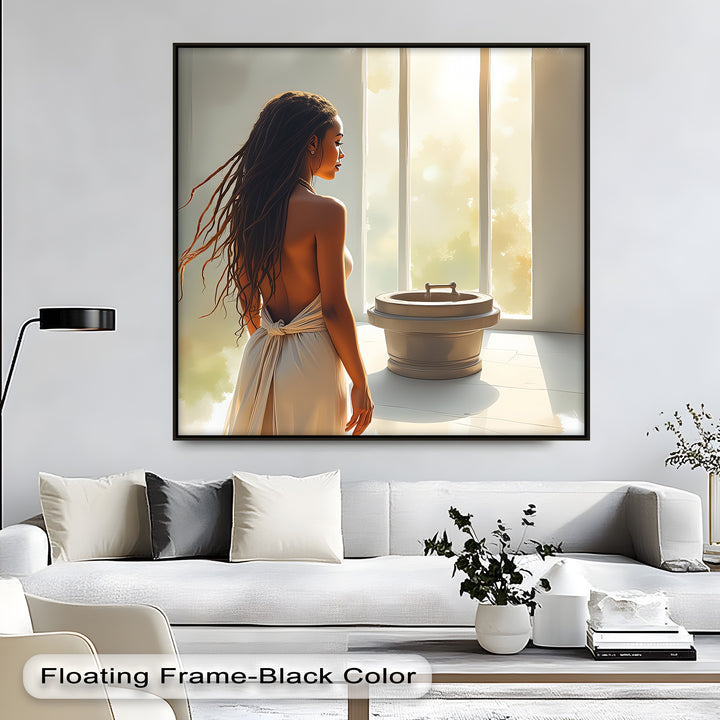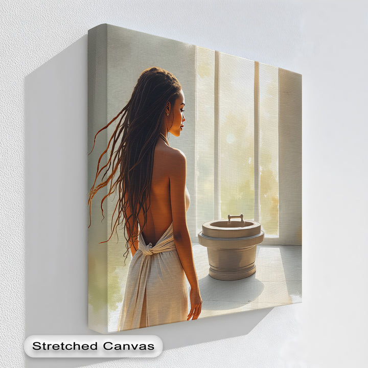 This luminous canvas print captures the gentle profile of a woman wrapped in an ivory cloth, standing in quiet contemplation beside a Roman-style bath. The golden daylight pours in through tall windows, bathing her skin and long dreadlocks in a soft glow that evokes stillness, peace, and inner elegance.