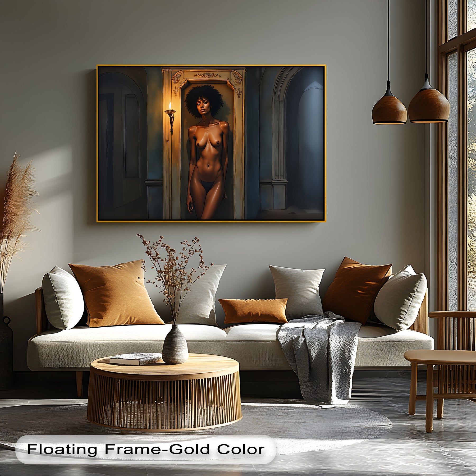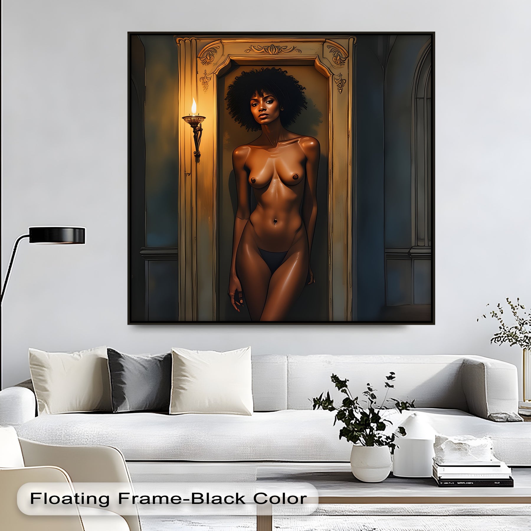 Embrace the dark elegance of Nocturne Flame, a powerful piece of sensual canvas wall art that captures feminine confidence and grace under the flicker of torchlight. With her striking posture and serene expression, the subject stands as a living sculpture — a muse illuminated by golden shadows in a gothic alcove. This captivating vertical canvas art invites mystery and awe into your personal space.