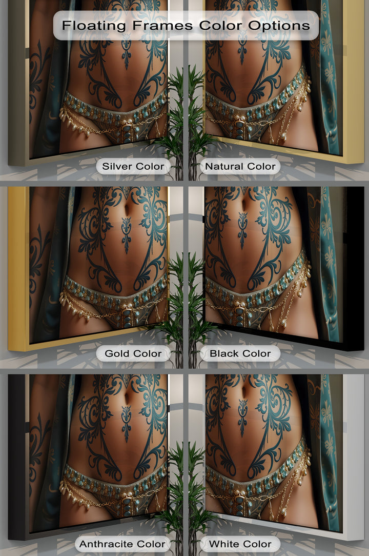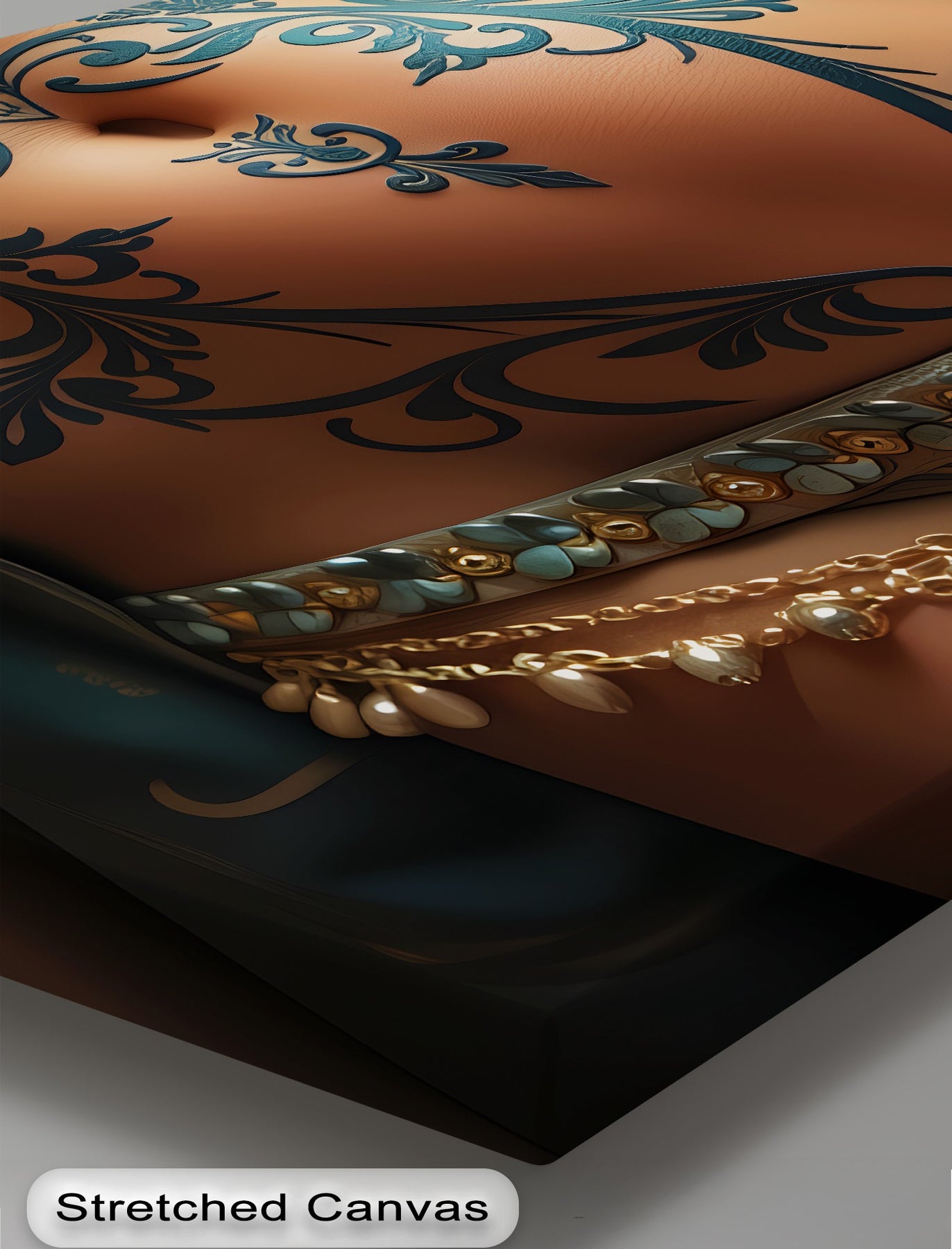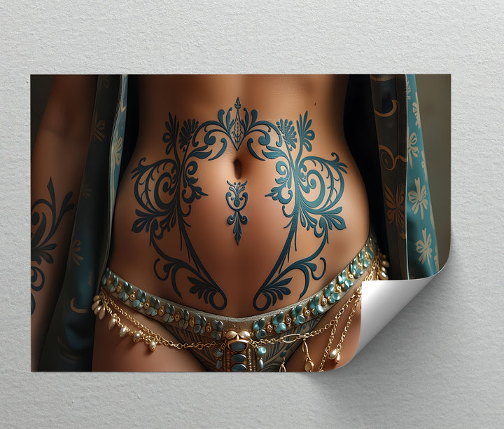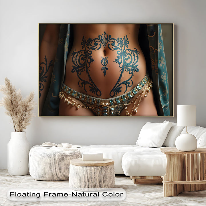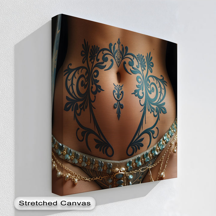 Ornate Desire invites the viewer into a world of sensual ornamentation and intimate artistry. This erotic canvas wall art focuses on the intricately inked torso of a woman, where flowing turquoise tattoos bloom like floral vines across her toned skin. Every detail—from the gold-beaded chains to the opulent patterned fabric—evokes mystery, elegance, and exotic desire.