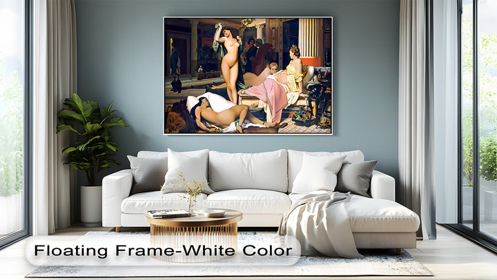 Palace Reverie immerses you in a lavish ancient palace where reclining goddesses and poised muses embody sensual freedom and regal beauty. Draped in golden silks or glowing bare against marbled halls, each figure exudes classical elegance. This framed canvas wall art echoes the timeless opulence of Greco-Roman aesthetics with a touch of provocative modernity.