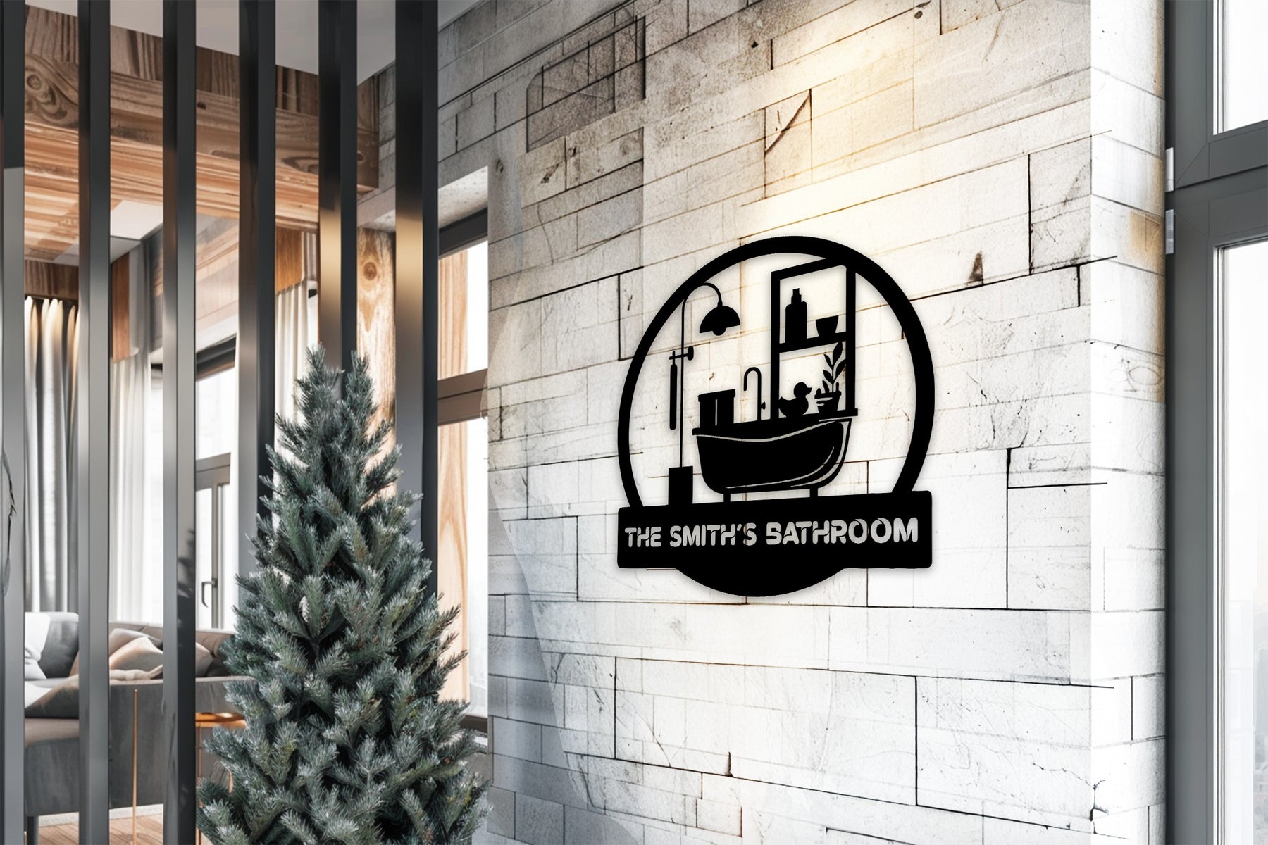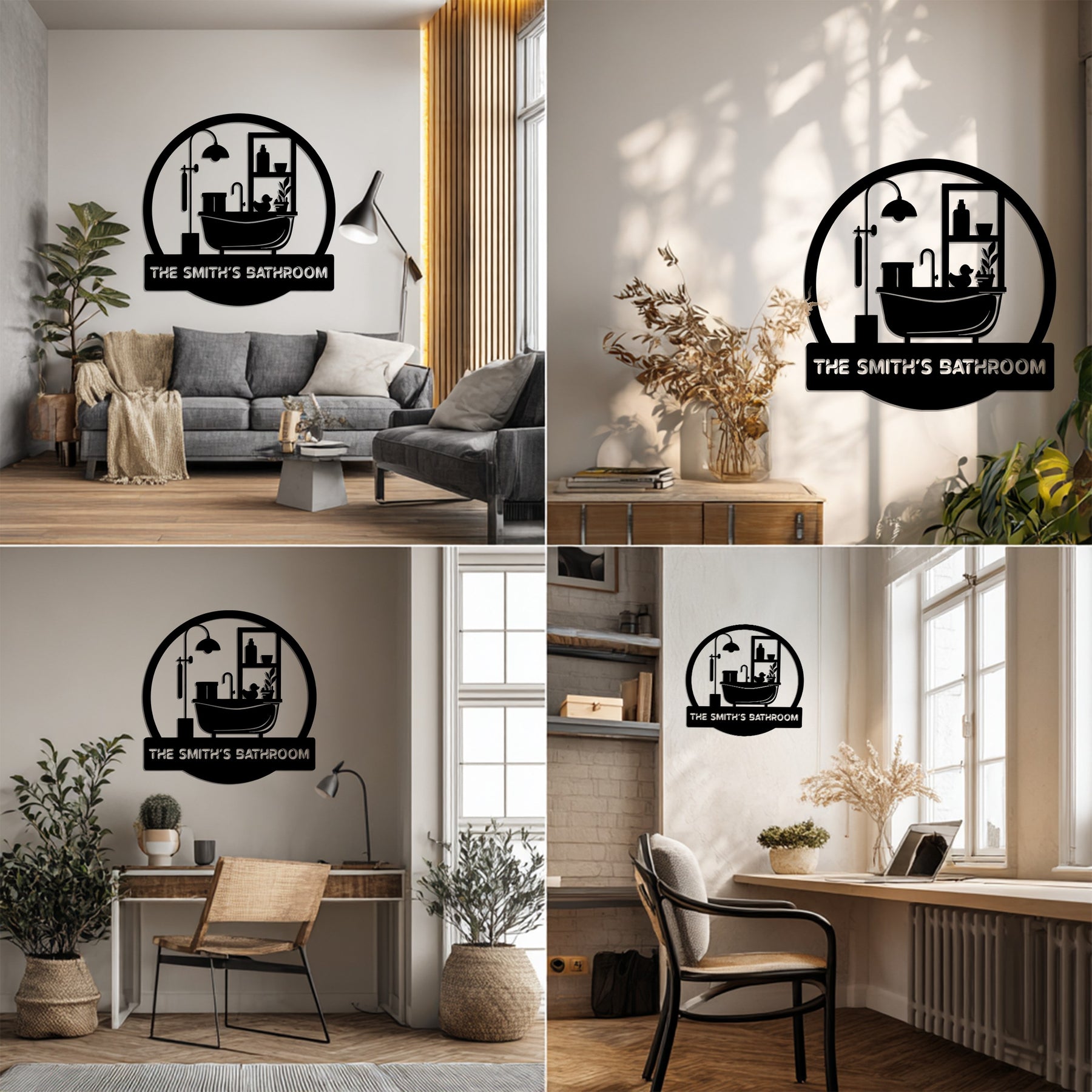 Transform your bathroom into a stylish and personalized retreat with the Custom Name Bathroom Metal Wall Art. Featuring a modern round frame with a detailed bathtub, shower, and shelf silhouette, this elegant design adds both charm and sophistication to your bathroom décor.