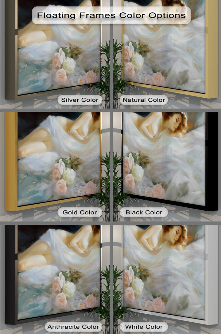 Our framed canvas wall art features a 3.5 cm (1.38 inch) thick floating frame, creating a striking depth effect that elevates your artwork with a luxurious, gallery-quality appearance. Available in multiple color options, the frame adds bold definition and a modern touch to any space.
