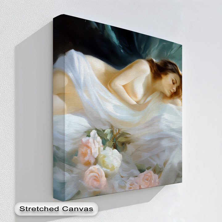 Petal Slumber invites you into a moment of floral serenity, where a sleeping muse lies draped in delicate white veils, embraced by soft roses and glowing light. Her peaceful form glows against a cascade of satin textures and ethereal folds, offering a sensual escape through canvas prints that blend fantasy and realism. This canvas wall art captures stillness, softness, and poetic femininity—ideal for intimate and elegant interiors.