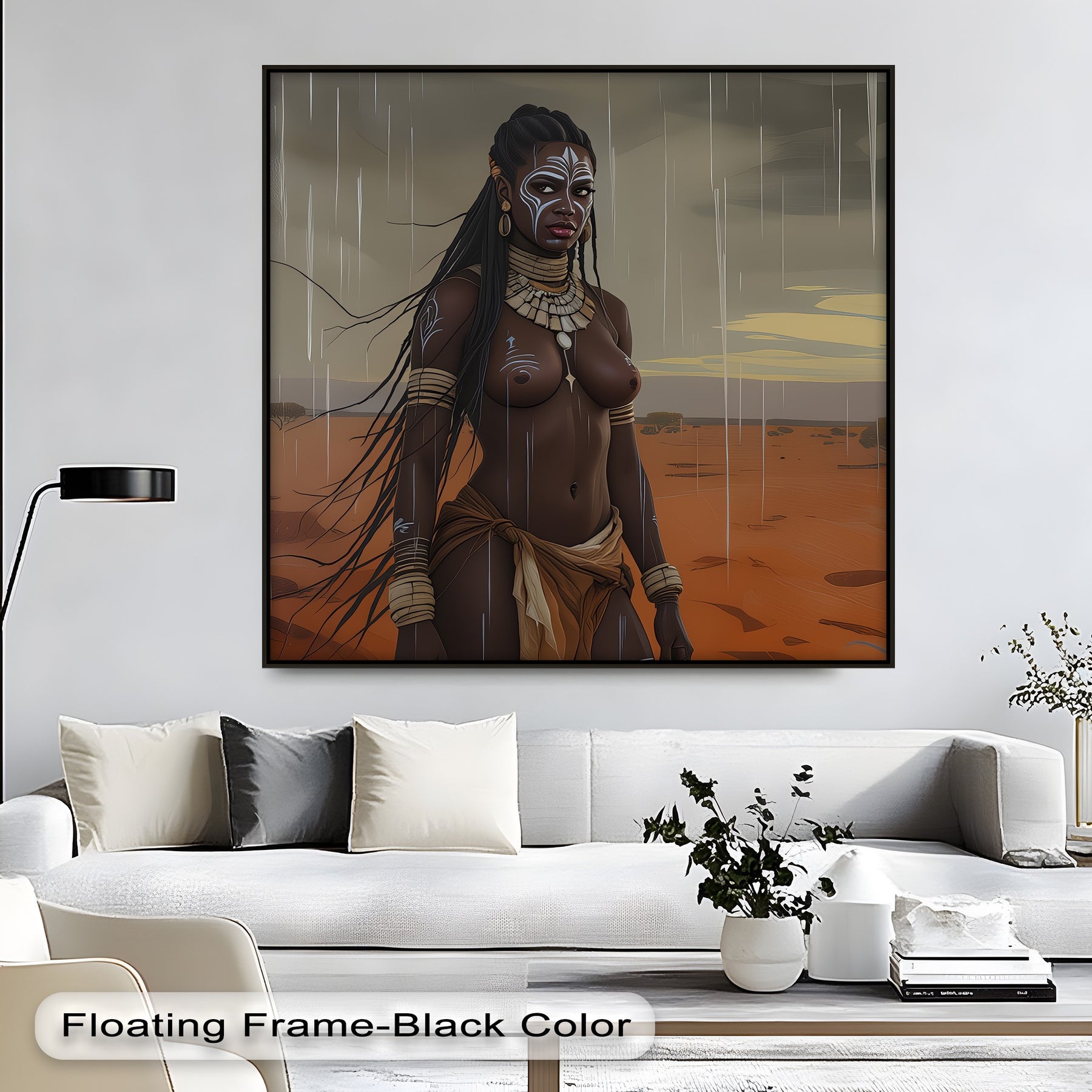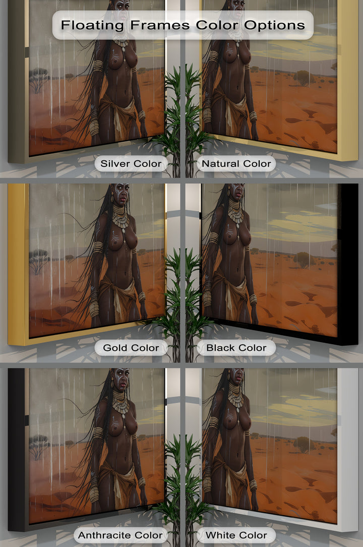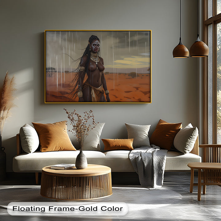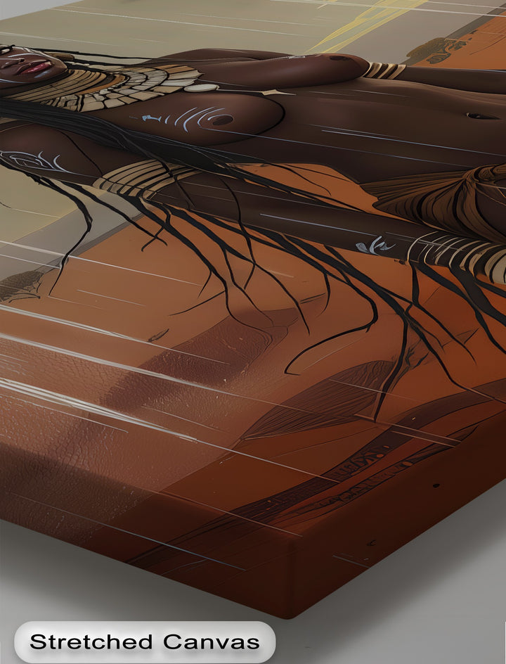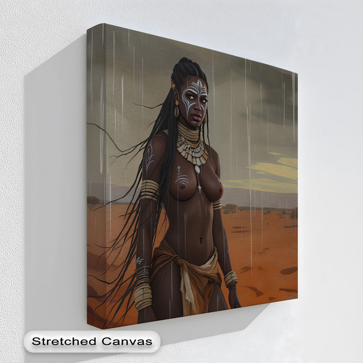 Bold, proud, and elemental—Rain Queen captures a striking vision of feminine power under storm-filled skies. This erotic canvas wall art features a tribal warrior woman adorned with ritual paint and traditional jewelry, standing tall in the rain-drenched savanna. Her steady gaze, the flowing braids, and desert tones behind her speak to strength, sensuality, and deep cultural roots.