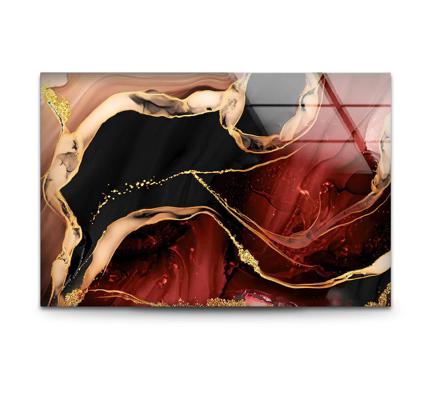 Add bold elegance to your space with this Red and Black Abstract Wall Art, featuring rich swirling tones of crimson, black, and nude with striking gold accents. Designed to mimic luxurious marble textures, this dramatic composition is UV printed on premium tempered glass for ultra-vivid detail and shine. Perfect for upscale modern interiors, hotel-style decor, or statement-making living spaces, this piece brings a sophisticated edge and artistic depth to your walls.