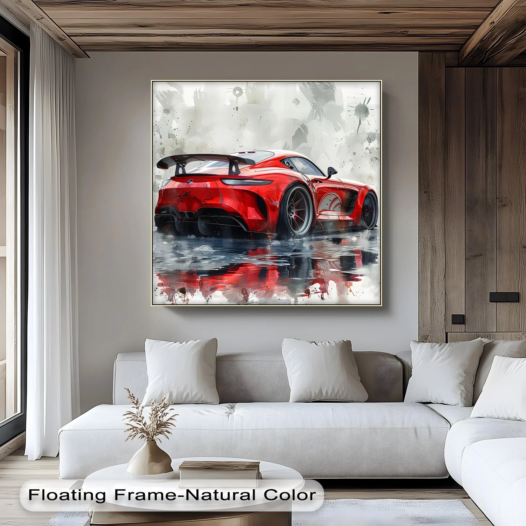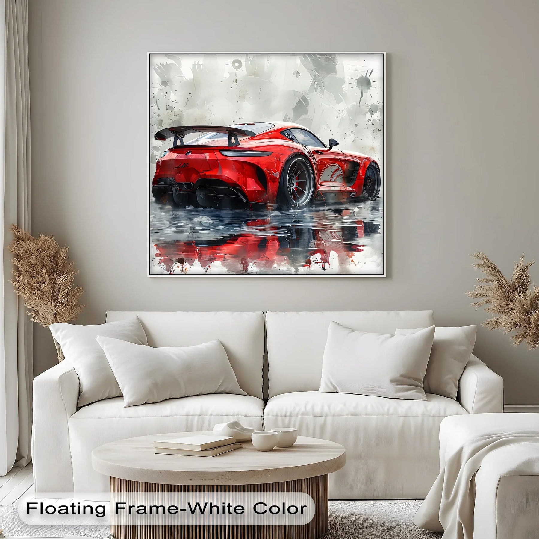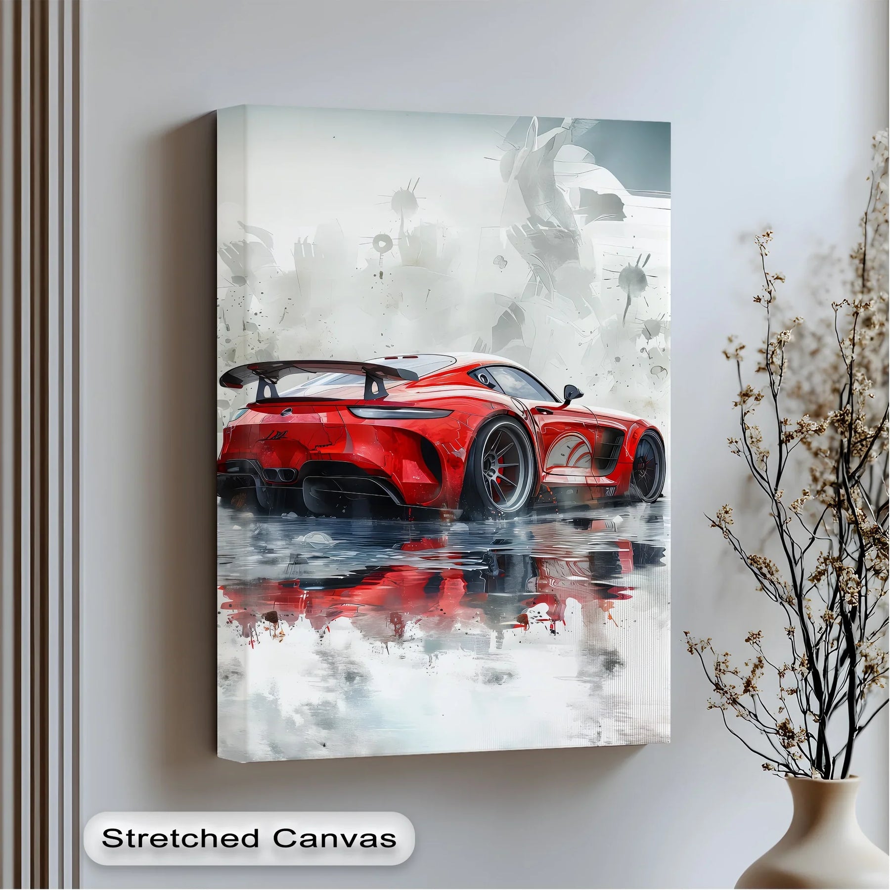 Make a bold statement with this car canvas print featuring a sleek red hypercar captured from behind, reflected dramatically in a glossy, rain-soaked track. The blurred abstract background suggests motion and adrenaline, making this a standout piece for sports car enthusiasts and lovers of cutting-edge automotive design.