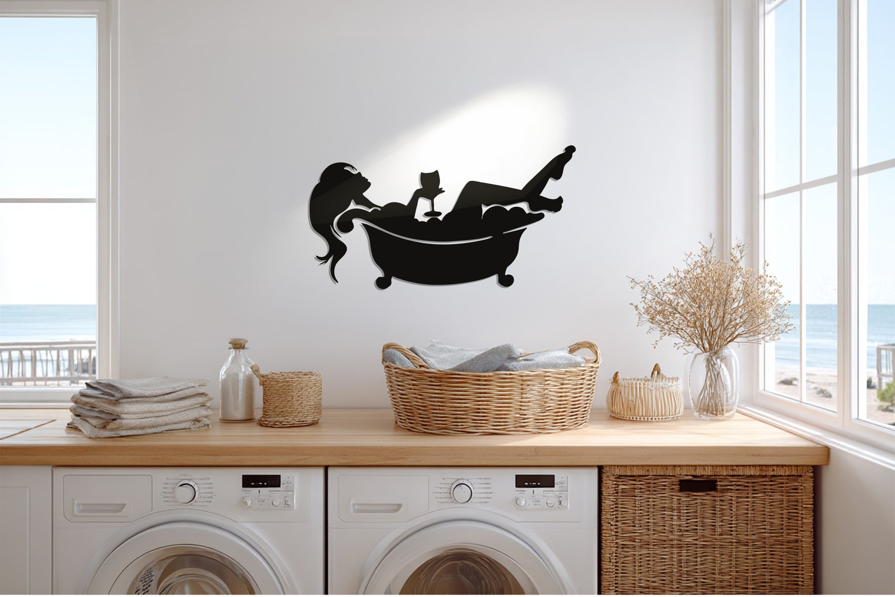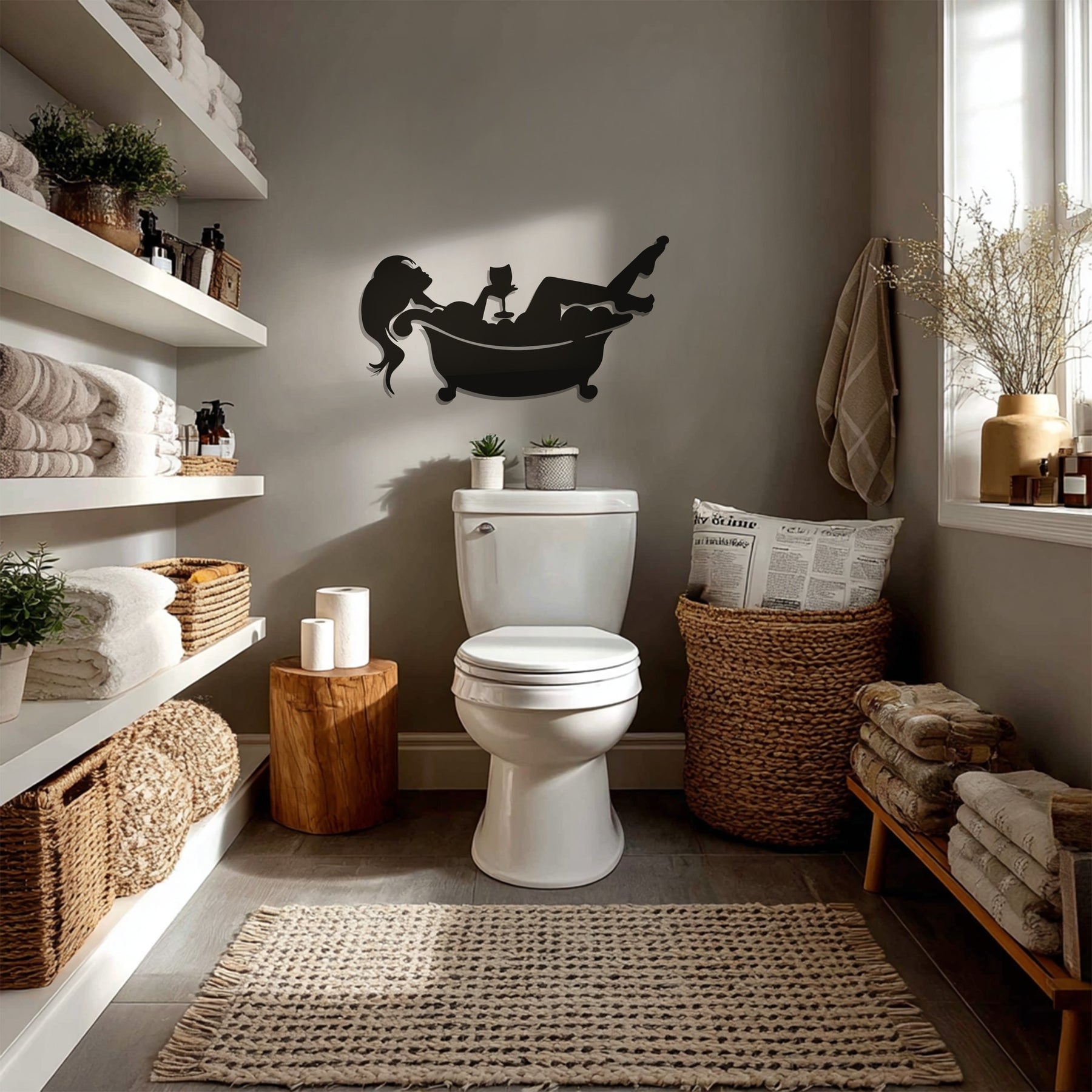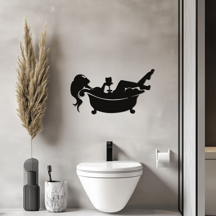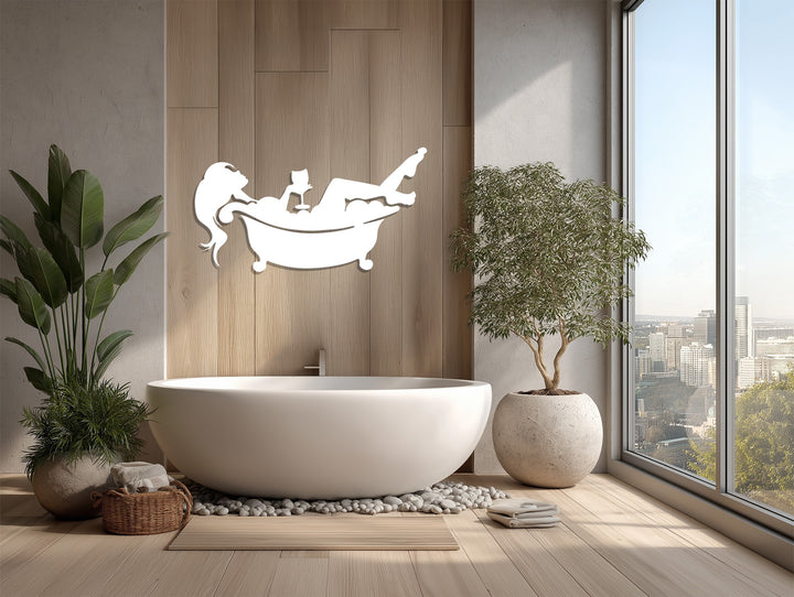 Transform your bathroom into a sanctuary of calm with the Relaxing Bath Silhouette – Modern Metal Bathroom Wall Art. This elegant piece features a minimalist silhouette of a woman reclining in a bubble-filled tub, enjoying a glass of wine — a perfect symbol of relaxation and self-care. Its artistic simplicity and smooth matte finish bring sophistication to any bathroom or spa-like space.