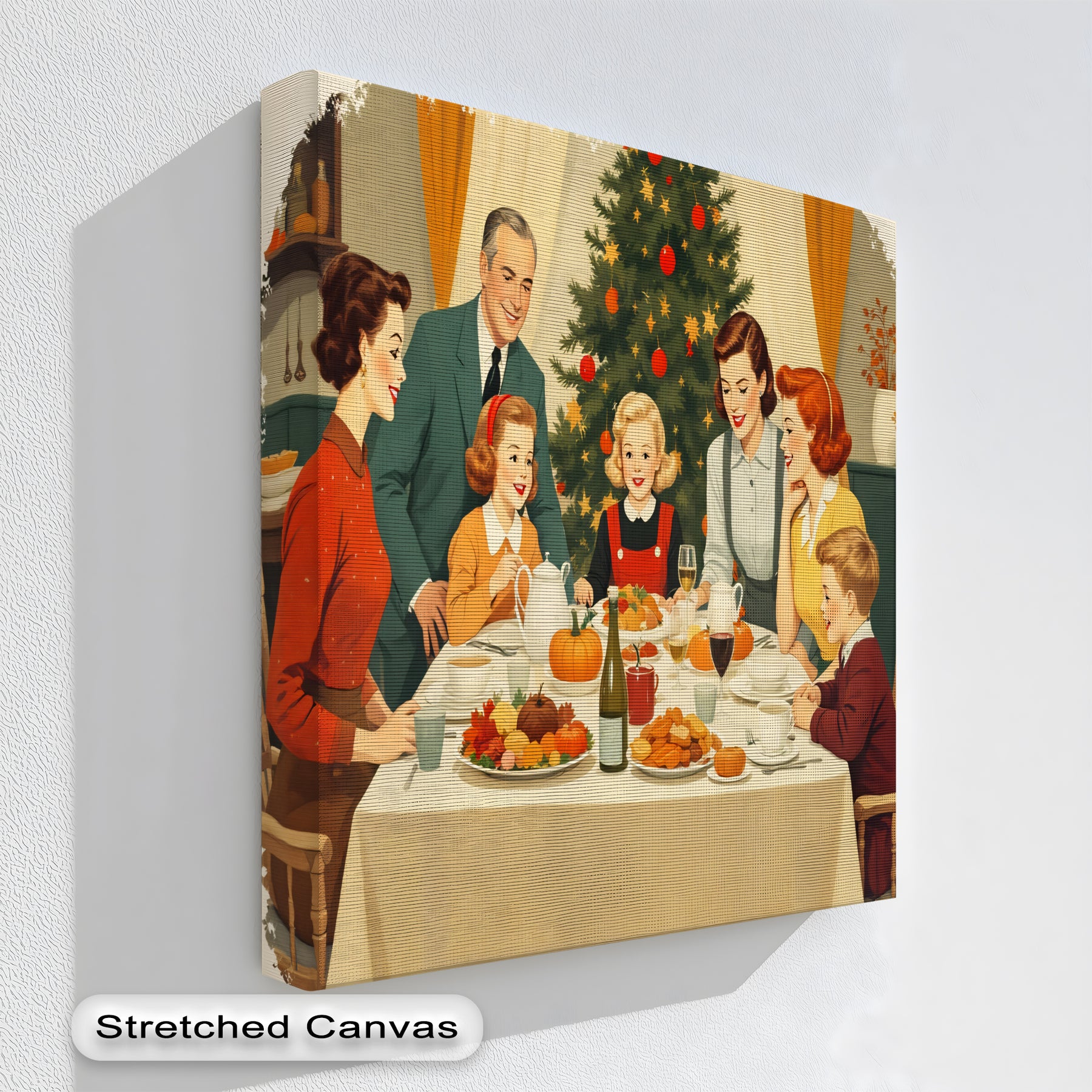 Step back in time with Holiday Harmony, a retro family Christmas dinner canvas wall art that beautifully captures the warmth of mid-century holiday traditions. Around a festive table adorned with pumpkins, holiday treats, and wine, a cheerful family gathers beneath a glowing Christmas tree. This nostalgic holiday wall art brings the timeless spirit of love, joy, and togetherness into your home.