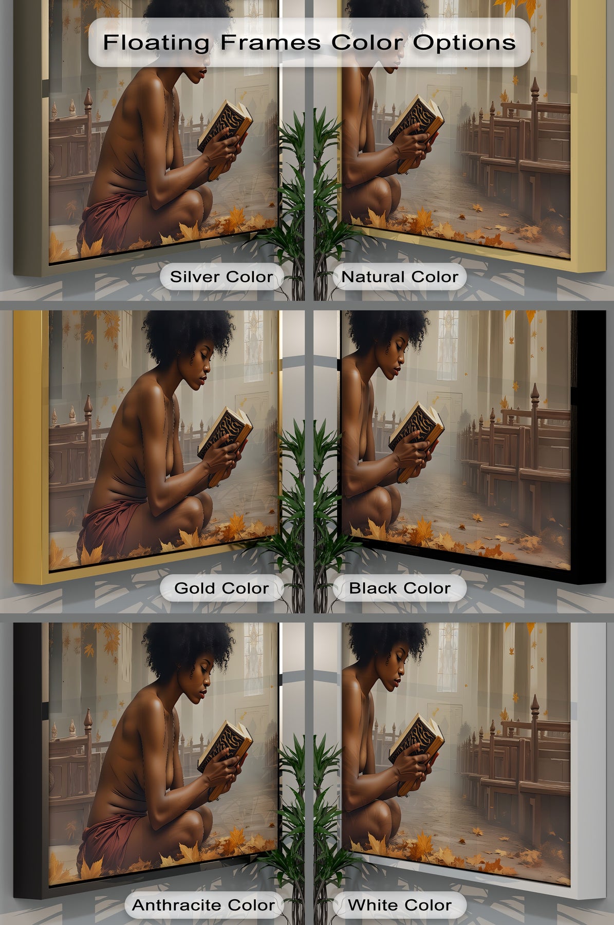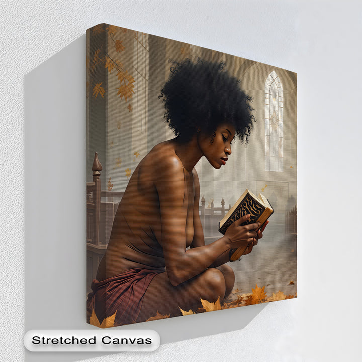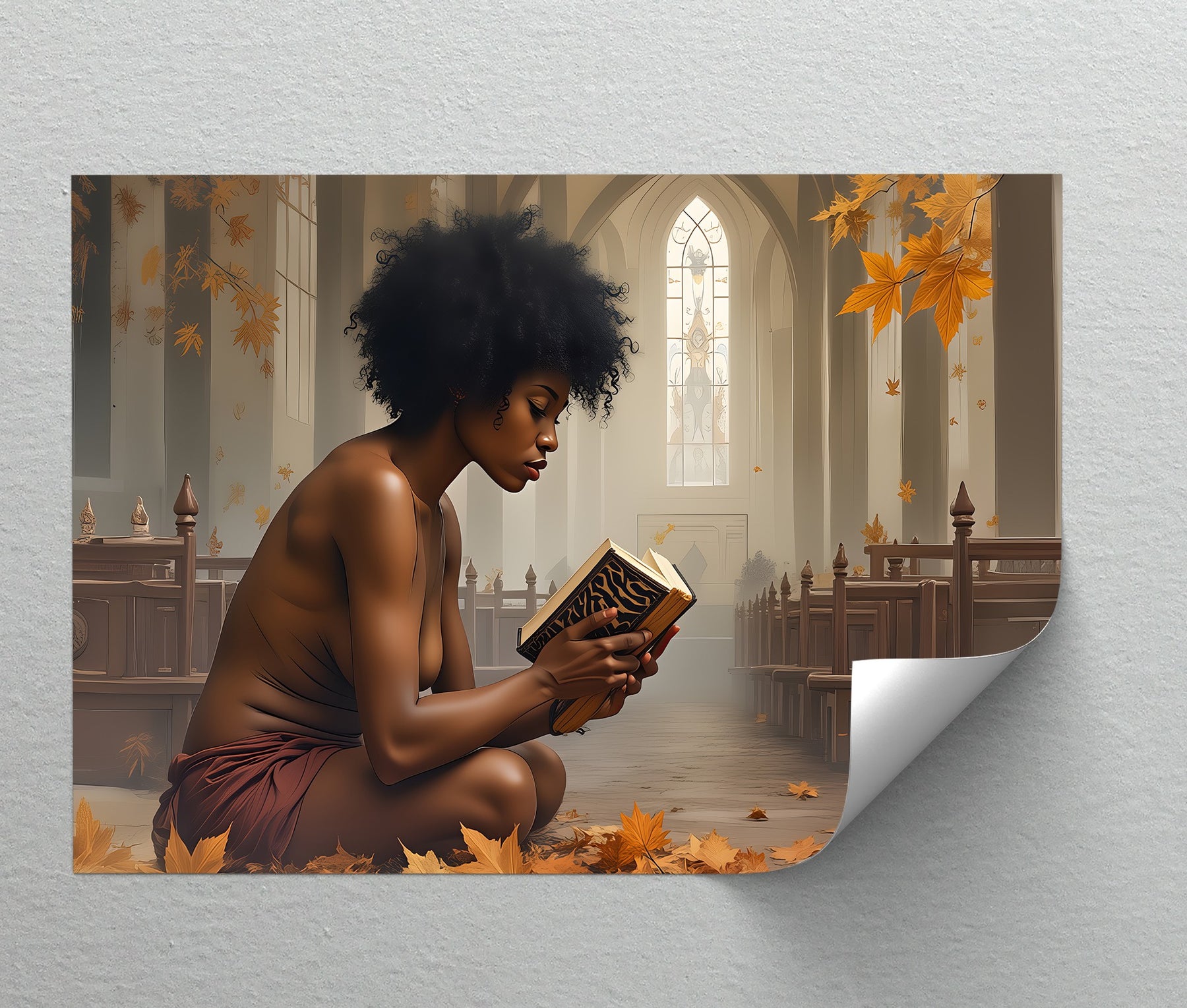 Let your interiors breathe with the quiet reverence of Sacred Silence, a poetic piece of erotic canvas wall art that captures a powerful moment of solitude, wisdom, and sensuality. Depicting a graceful woman absorbed in a book beneath autumn leaves inside a grand cathedral, this artwork canvas evokes themes of introspection and empowerment with a sensual undertone.