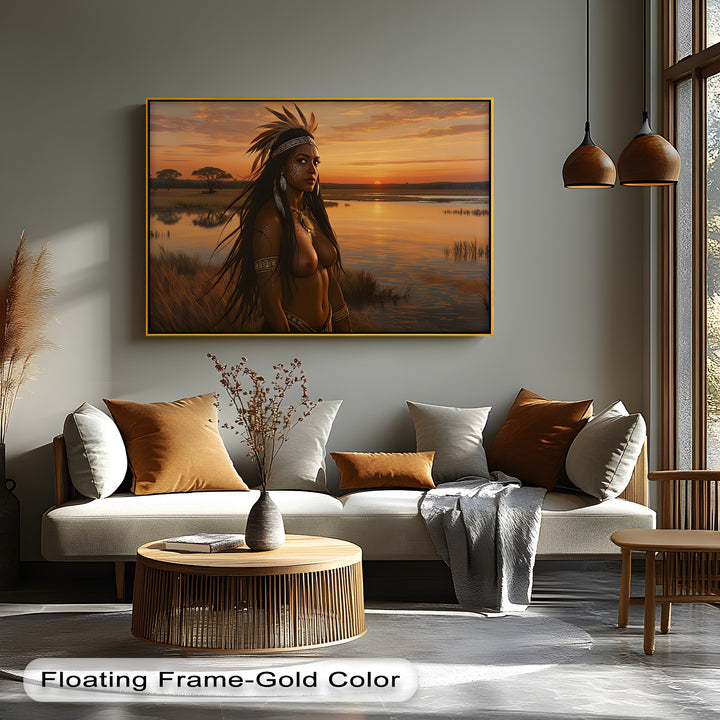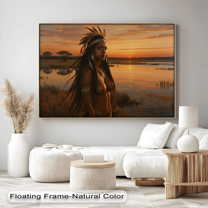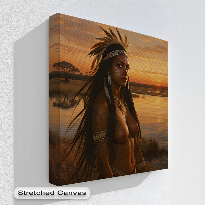 Savannah Muse captures the raw elegance of a woman adorned in tribal ornaments, standing at the edge of a glowing savannah river as the sun sets behind her. This erotic canvas wall art blends cultural mystique with natural sensuality, celebrating both strength and femininity through the curves of the body and the symbolism of body paint and feathers.