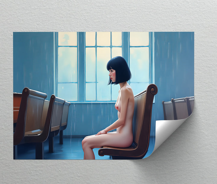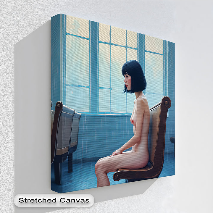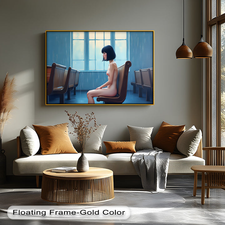 Step into the haunting stillness of Silent Rain, a provocative piece of erotic canvas wall art that explores the vulnerability of isolation and the silence that speaks volumes. A lone woman sits in contemplative quiet, her body bare, her gaze lost in thought, as soft rain streaks the chapel windows—a visual whisper of longing, memory, and restrained passion.